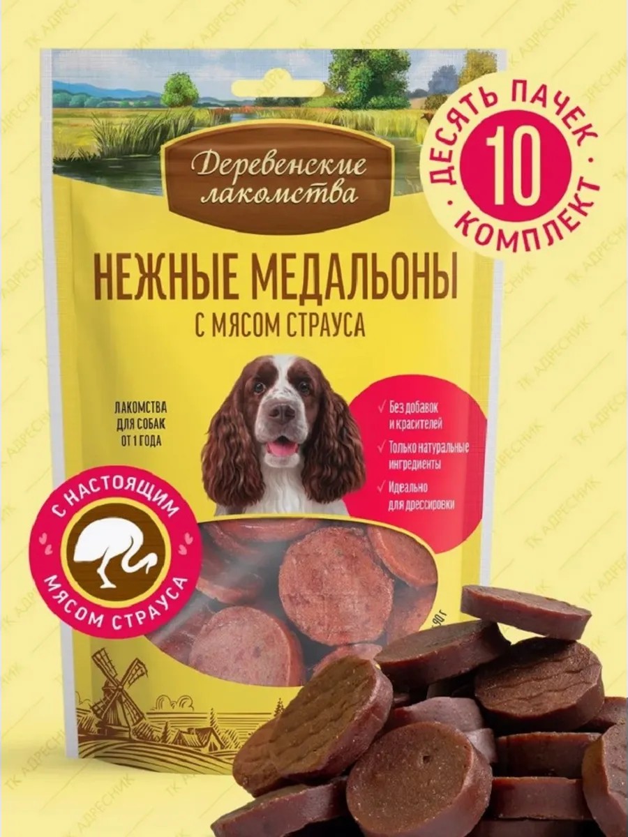 Деревенские лакомства Лакомство для взрослых собак Медальоны с мясом страуса, 10шт