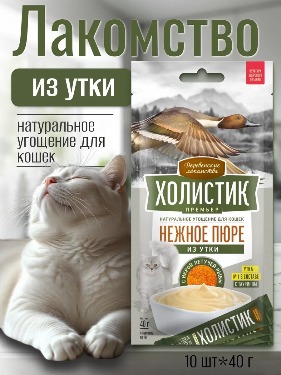 Попробуйте наши новые изысканные десерты «Холистик Премьер». Нежнейшее пюре из отборного мяса утки, с добавлением настоящего деликатеса — икры летучей рыбы, порадует вашу кошку ярким, насыщенным вкусом. Удобная упаковка позволит вам проводить вместе незабываемые минуты, кормя вашего любимца прямо из пакетика.