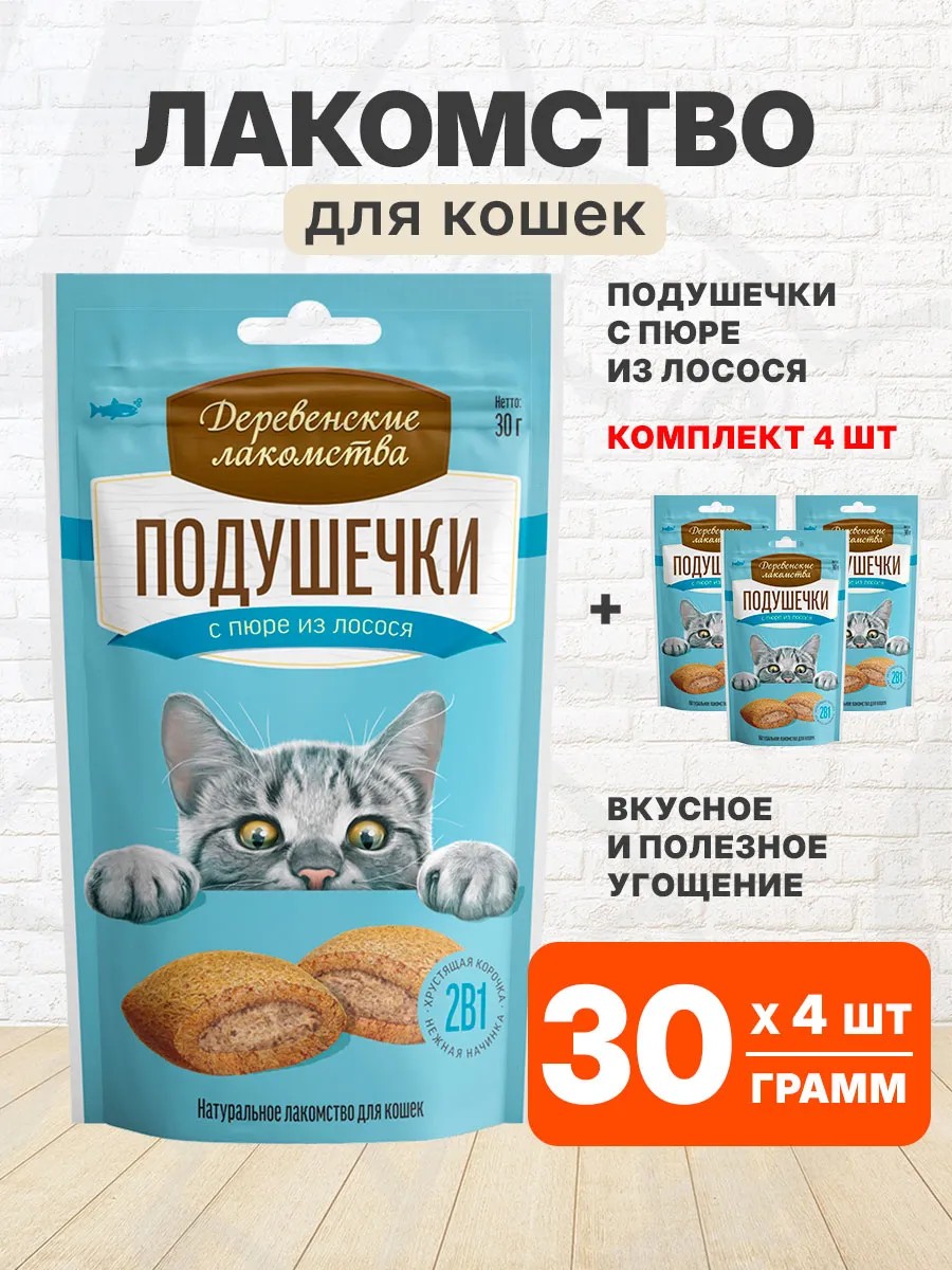 Деревенские лакомства Лакомство подушечки с пюре из лосося для кошек 30 г 4 шт