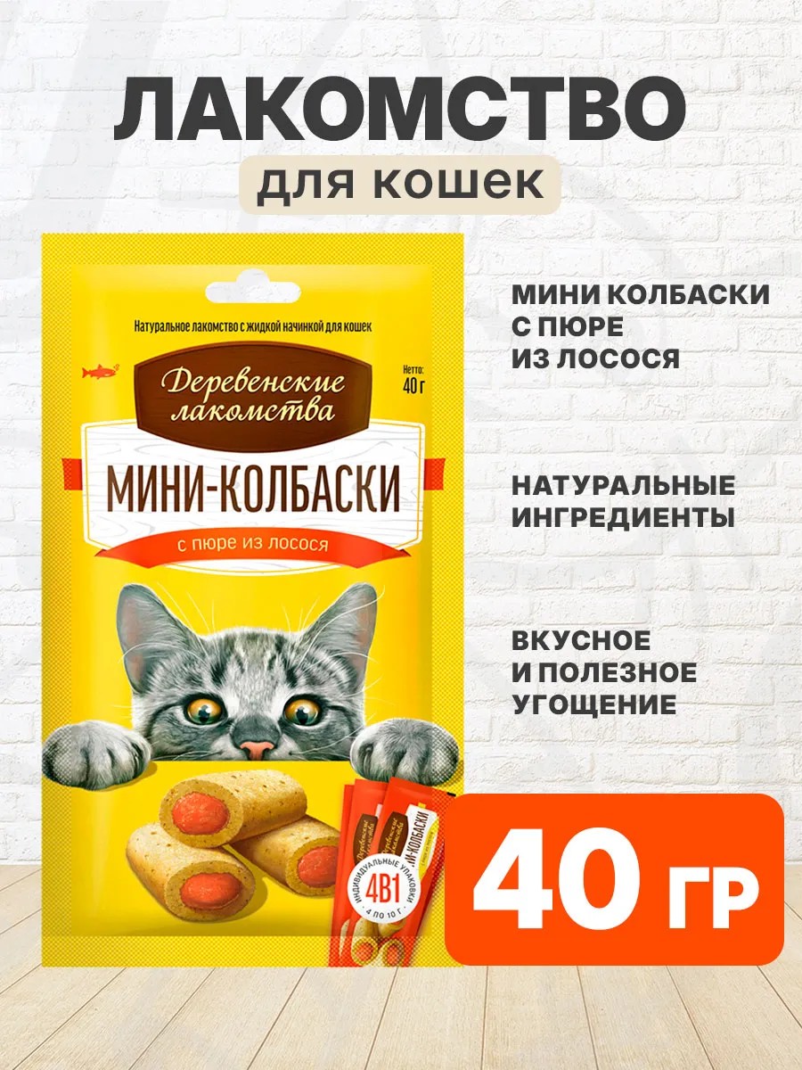 Лакомства ДЕРЕВЕНСКИЕ для кошек мини колбаски с пюре из лосося 4 шт. Натуральное лакомство из настоящего мяса в сочетании с ярким вкусом нежного пюре из лосося.