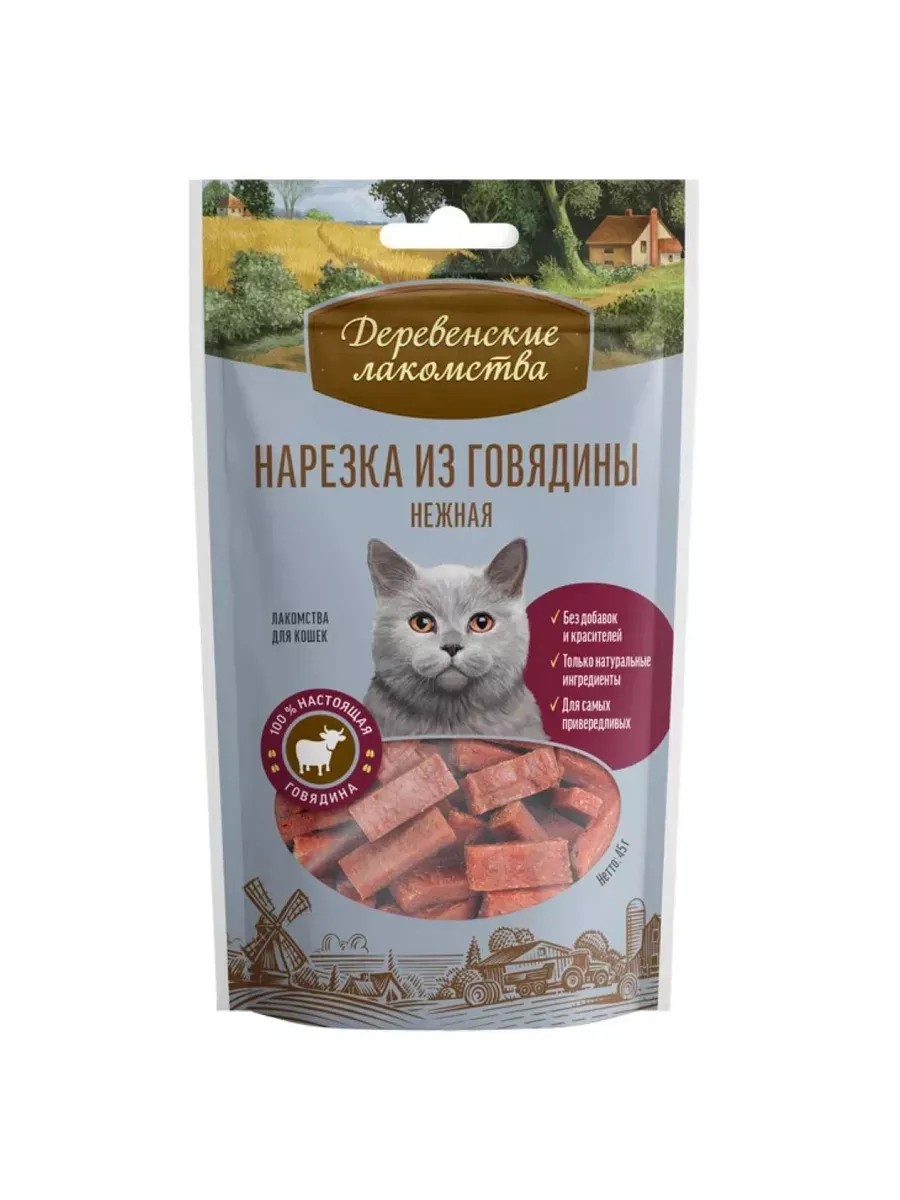Деревенские лакомства, Лакомство для кошек Нарезка из говядины нежная, 45 г, 1 уп.