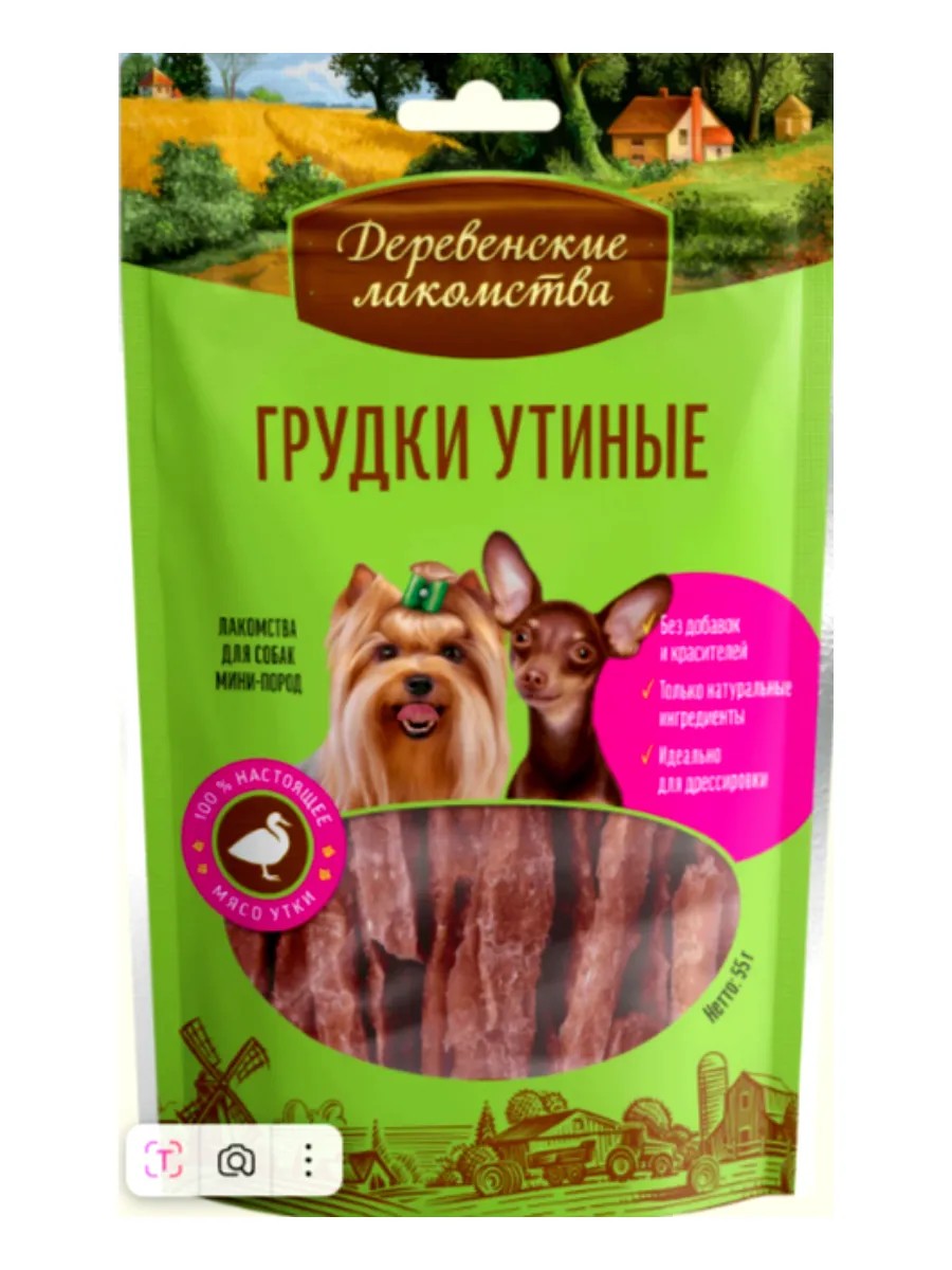 Удивите своего любимого питомца вкусняшкой "Грудки утиные" Деревенские лакомства. Это полезные лакомства, обогащенные витаминами и менералами для собак мелких и средних пород. Лакомства идеальны для разных целей: дрессировки, чистки зубов или как просто угощение для вашего питомца. Они имеют небольшой размер, что делает их идеальными для маленьких питомцев.