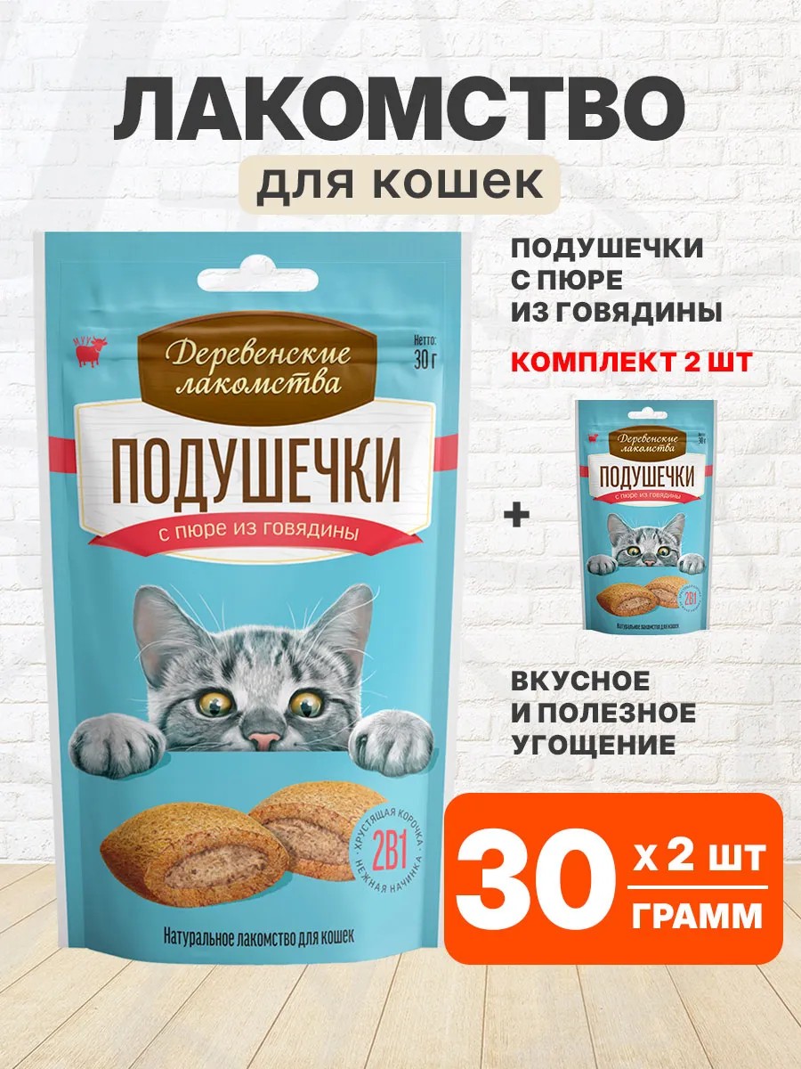Деревенские лакомства Лакомство подушечки с пюре из говядины для кошек 30 г 2 шт