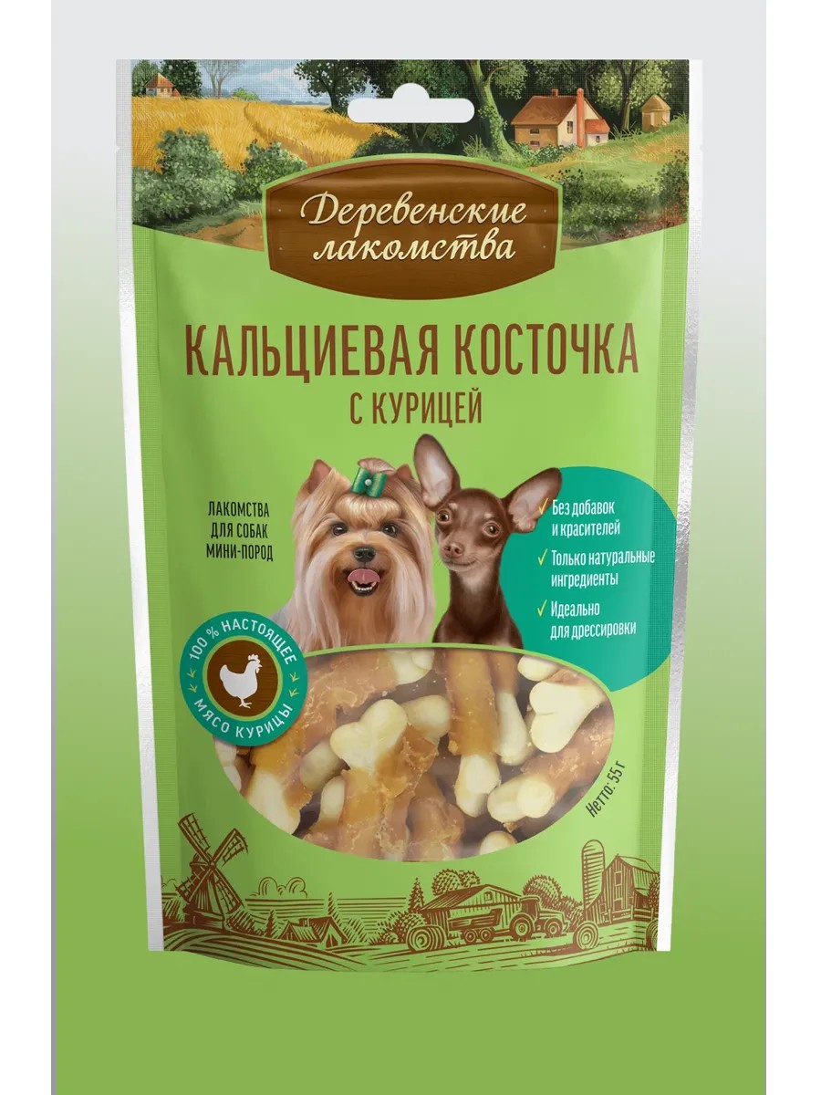 В основе «Деревенских лакомств» лежат традиции поощрения домашних питомцев, совмещенные с современными знаниями в области ветеринарии и здорового питания животных. Натуральные лакомства для собак изготовлены с учетом сбалансированного питания из качественных, безопасных и тщательно подобранных ингредиентов. Идеальные для дрессуры и поощрения "Деревенские лакомства" отбираются и обрабатываются вручную и могут служить эталоном лакомств для домашних животных. Любимое угощение теперь специально для собак мини-пород. Полезная кальциевая косточка и кусочки куриного филе создают, возможно, лучшее лакомство для собак. Состав: филе курицы, кальциевая косточка, субпродукты растительного происхождения, минералы. Пищевая ценность, %: белки — 26, жиры — 2.5, клетчатка — 0.2, зола — 3.5, влажность — 18. Энергетическая ценность: 280 ккал. Товар сертифицирован.