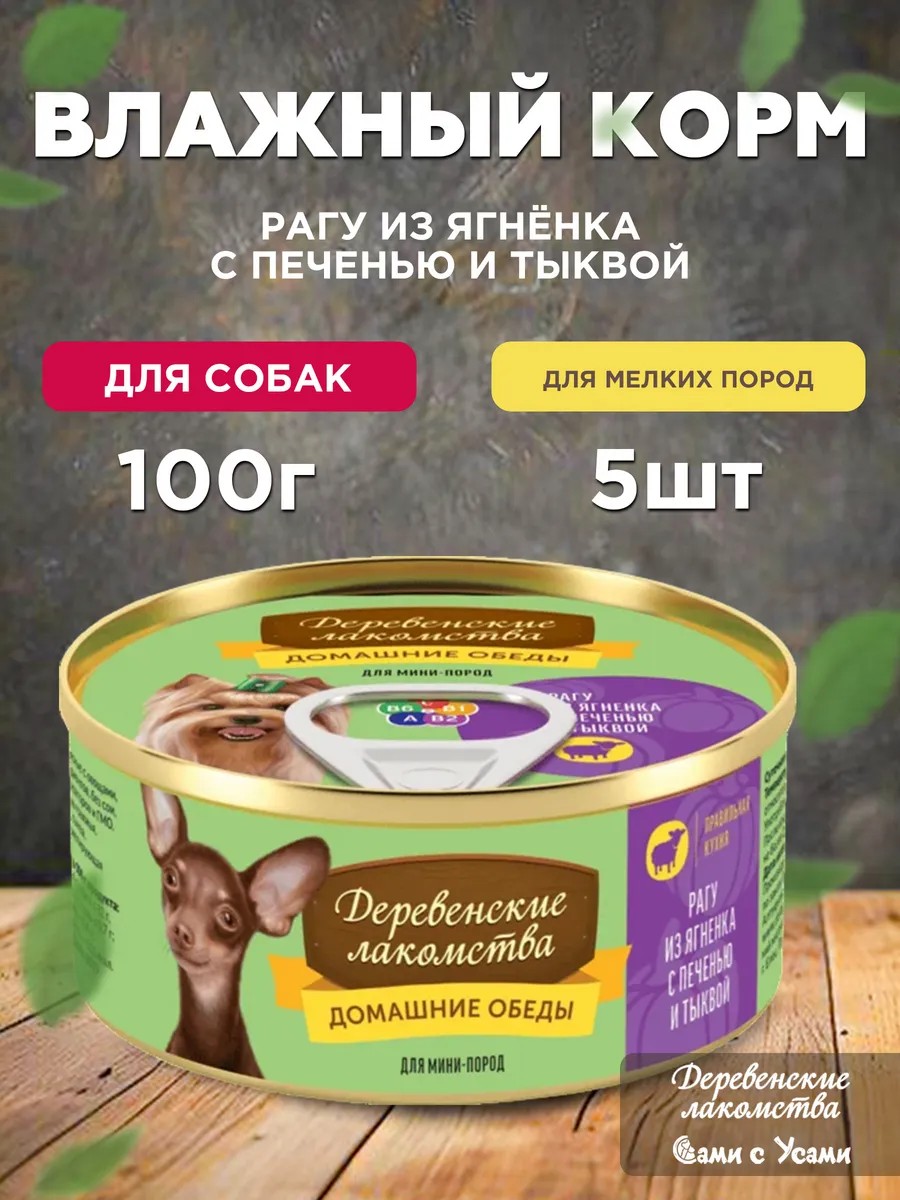 Представляем вам влажный корм для собак "Деревенские лакомства", специально разработанный для взрослых собак миниатюрных пород. Этот корм - идеальный выбор для обеспечения полноценного питания вашего питомца. Каждая упаковка весом 100 г состоит из 5 удобных пакетиков, что делает его комфортным в использовании и легким для хранения.br/br/Корм с ягнёнком, печенью и тыквой в желе обладает высоким содержанием аппетитного мяса, что делает его привлекательным для самых привередливых собак. Ягнёнок – источник полноценного белка, который поддерживает здоровье и активность вашего любимца. Включение печени обогащает рацион витаминами и минералами, необходимыми для укрепления иммунной системы.br/br/Кроме того, тыква, входящая в состав корма, известна своими питательными свойствами. Она способствует поддержанию нормального пищеварения, что особенно важно для маленьких собак. Сочетание всех этих натуральных ингредиентов не только улучшает вкус, но и делает корм сбалансированным для ежедневного рациона.