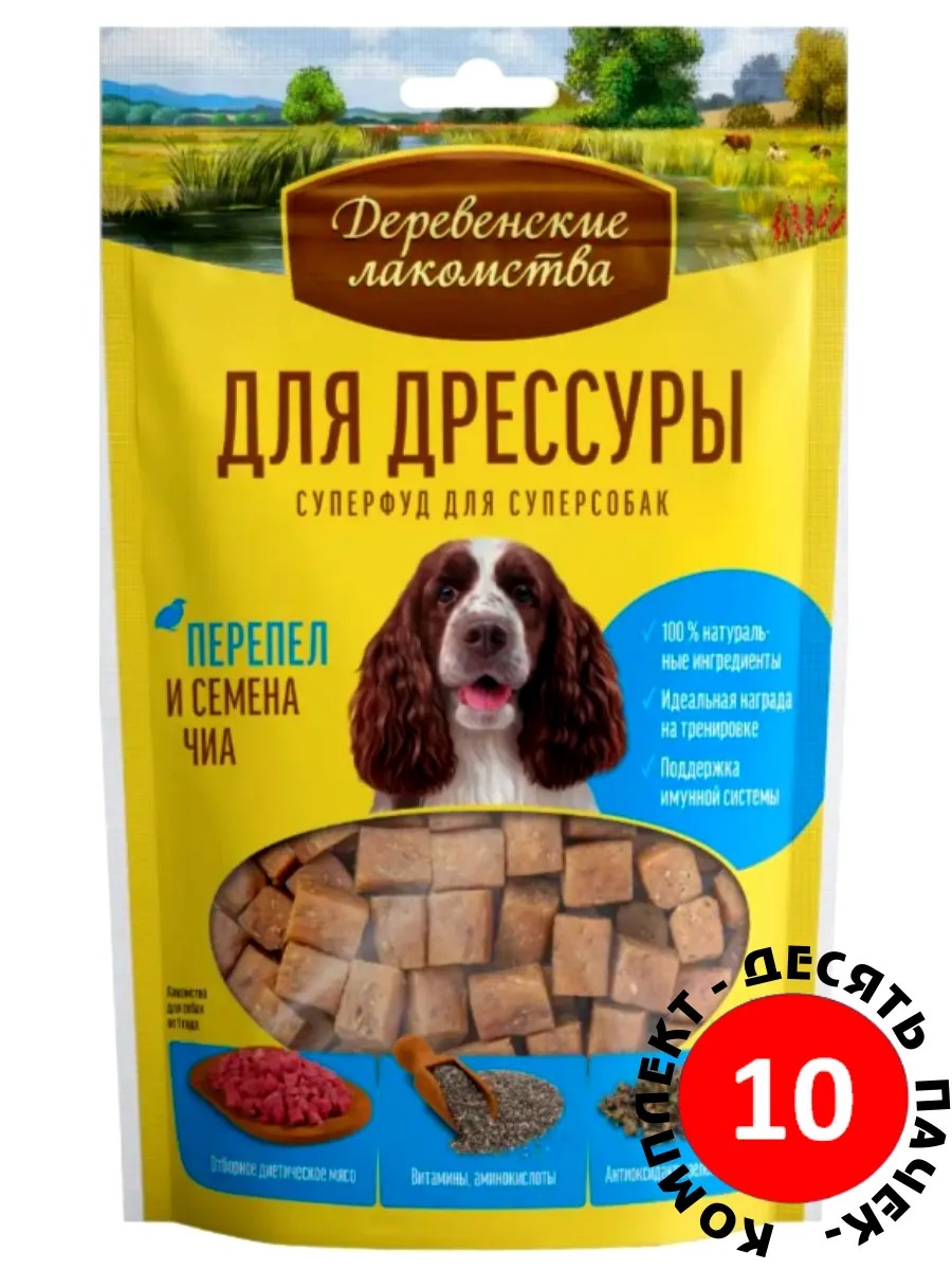 В основе «Деревенских лакомств» лежат традиции поощрения домашних питомцев, совмещенные с современными знаниями в области ветеринарии и здорового питания животных. Натуральные лакомства для взрослых собак всех пород изготовлены с учетом сбалансированного питания из качественных, безопасных и тщательно подобранных ингредиентов. "Деревенские лакомства" отбираются и обрабатываются вручную и могут служить эталоном лакомств для домашних животных. Новое лакомство создано специально для дрессуры собак. Семена чиа содержат невероятное количество полезных компонентов: витамины, минералы, аминокислоты, Омега-3, Омега-6. Перепелиное мясо – настоящий деликатес. Эта комбинация создает идеальное лакомство для собак. Кусочки имеют универсальный размер, что делает их идеальными для разного размера питомцев. Это полезная и вкусная добавка к основному комплексному питанию вашего любимца, позволяющая разнообразить сбалансированный рацион.