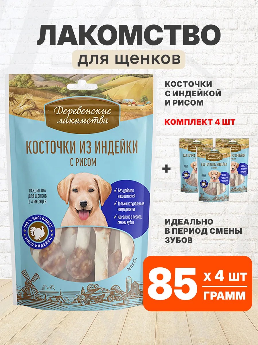 | Комплектация | Лакомства деревенские для поощрения щенков косточки с индейкой и рисом 85 гр - 4 шт |