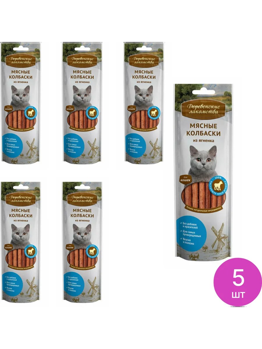 Derevenskie Delikatsya Lamb Meat Sausage Treats for Cats, 45g / Dry Food. Set of 5. Price per set. Derevenskie Delikatsya Lamb Meat Sausage Treats for Cats are a tasty and healthy treat for your four-legged family members. Cats devour them with pleasure and are willing to learn complex commands and become the most obedient pet for their owner. This treat will delight even the most demanding pet. This product meets all animal health safety requirements and contains only quality-controlled ingredients: lamb, plant by-products, and minerals. Sold in a bag. Weight: 45g. This dry treat won't cause excess weight, normalizes digestion, and improves the condition of the coat, teeth, and bones. These tender sausages made from select lamb will delight even the most discerning cat. Want your furry friend to enjoy delicious food and get real pleasure from it? Buy a hearty, healthy treat from Village Treats: lamb sausages! Cat treats / cat supplies / cat food.