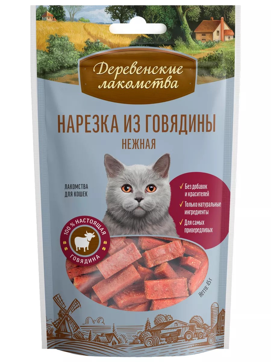 Лакомство Деревенские лакомства для кошек, нарезка из говядины нежная, 45 г. Нарезка из говядины нежная для кошек (100% мясо)Свежайшее мясо говядины - превосходное угощение для любимой кошки!