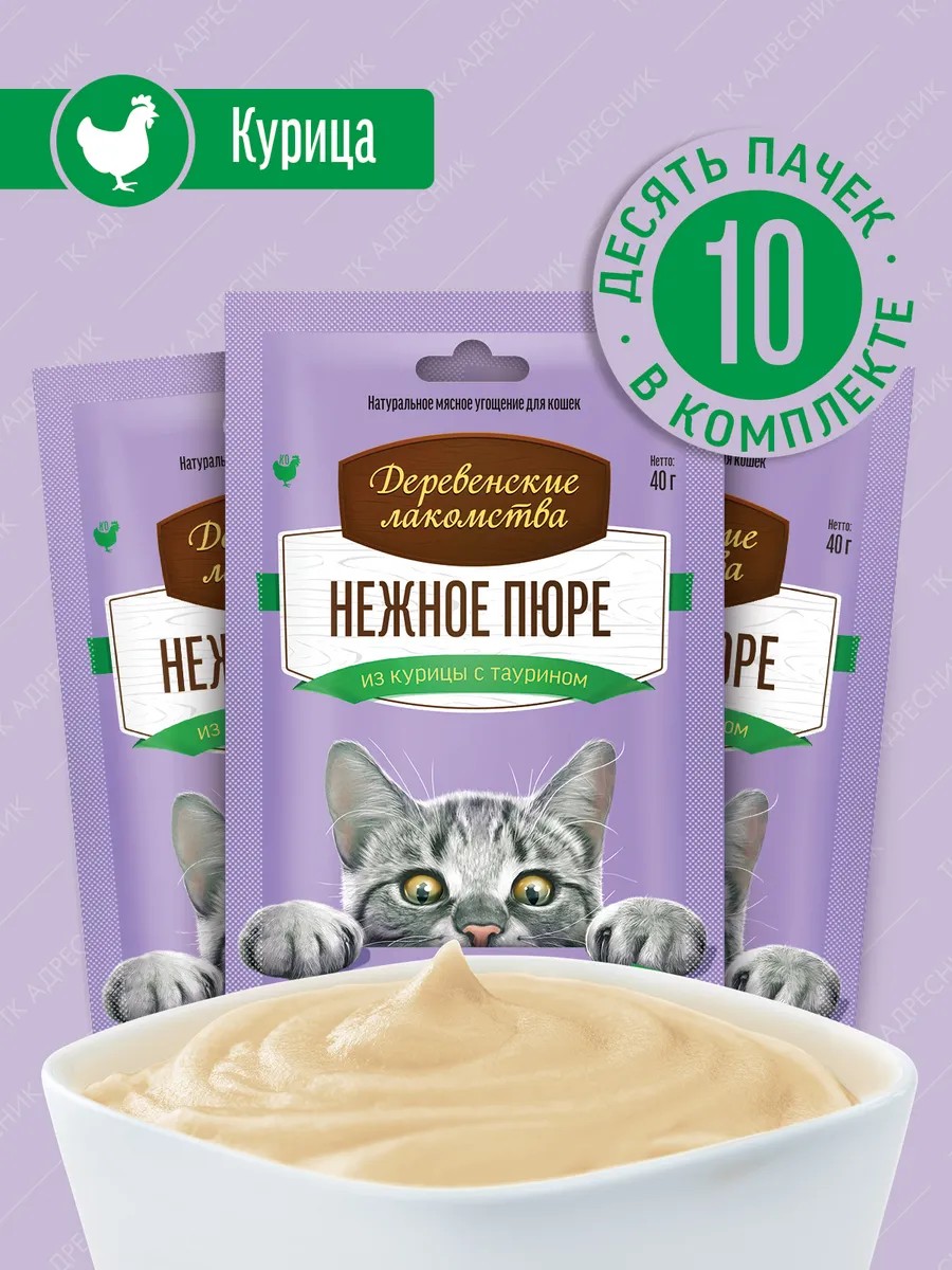 | Комплектация | Нежное пюре из курицы для кошек, 40 гр.*10 штук |