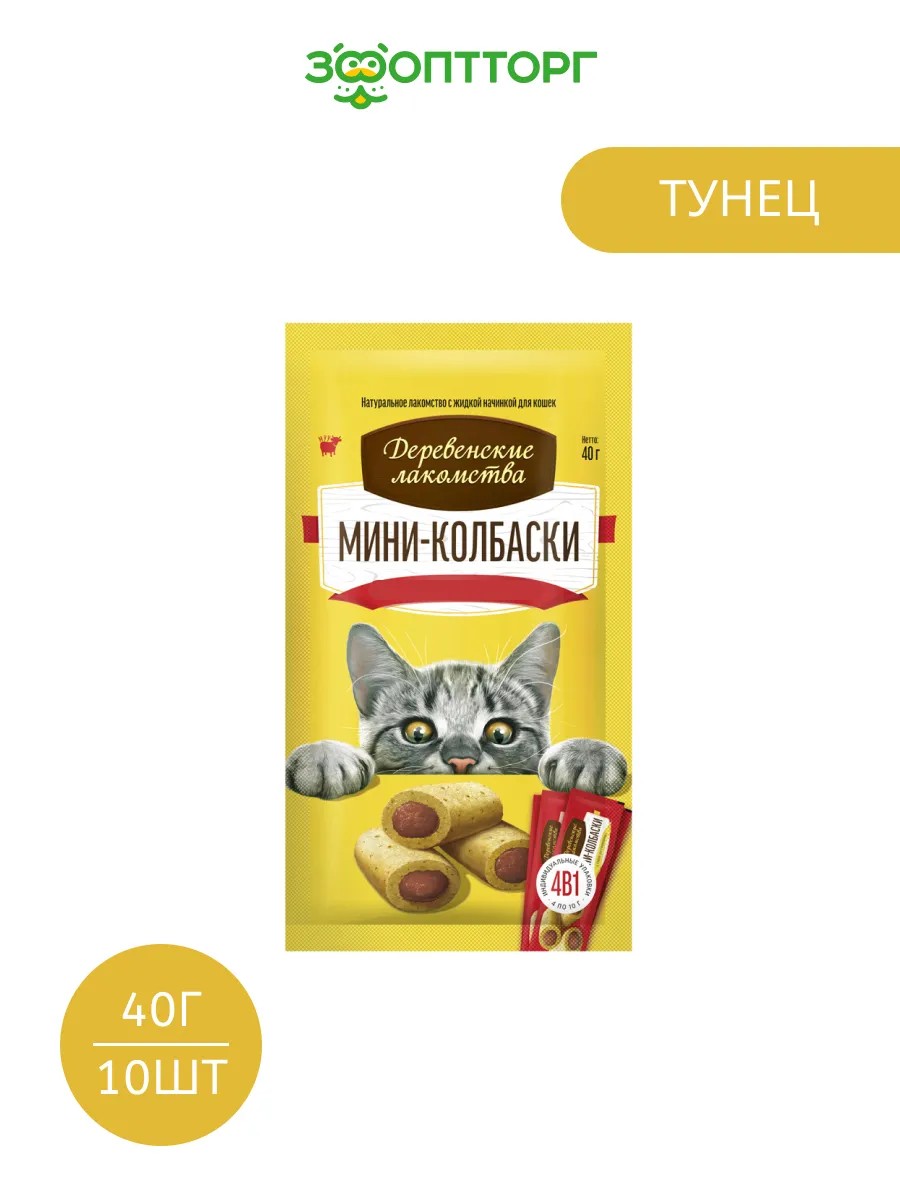 КомплектацияДеревенские лакомства "Мини-колбаски с пюре" для кошек, Тунец, 40г-10шт.