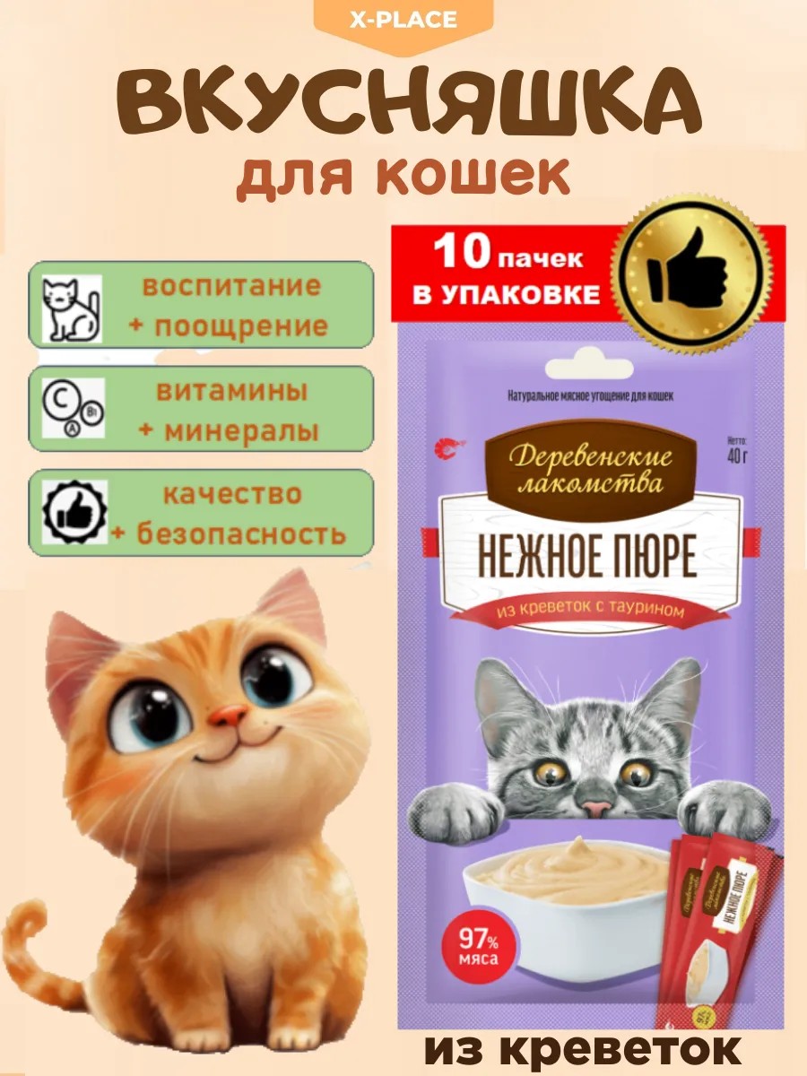 Нежное пюре для милых созданий Деревенские лакомства – идеальное дополнение кошачьего рациона. Оно создано по уникальной формуле с использованием исключительно натуральных компонентов, обладает непревзойденным ароматом, который непременно оценит каждый маленький котенок и привередливая взрослая кошечка. В ассортименте представлен набор из 10 штук со вкусом креветки Состав обогащены таурином и минералами. В коллекции есть также набор из 4 штук. Вкусняшки на основе мяса креветок и бульона из морепродуктов с растительным маслом и добавлением соли содержат комплекс витаминов, необходимых для полноценного роста и поддержания здоровья животных. Ваш домашний питомец непременно полюбит такую вкусность. Он соответствует нормам ветеринарии и принципам здорового питания. Съедобный деликатес богат протеином и позволит легко приучить котика к полезной еде. Это настоящее угощение для всех кошечек. Влажное угощение может использоваться в качестве средства для дрессировки и приучения питомца, положительно влияет на желудок и иммунную систему. Зоотовары выпускаются в мягкой упаковке удобного размера. Одной пачки хватит на большую миску. Такие полезные штучки станут идеальным выбором для кормления котов и кошек и взрослых животных. Благодаря тщательно подобранному составу, продукция обеспечивает полноценное питание, насыщает всеми необходимыми полезными веществами и витаминами. Ее с удовольствием будут есть все, даже самые требовательные коты. При этом хозяину не придется переживать по поводу выбора меню для домашнего любимца. Все необходимые питательные вещества находятся в одной упаковке!