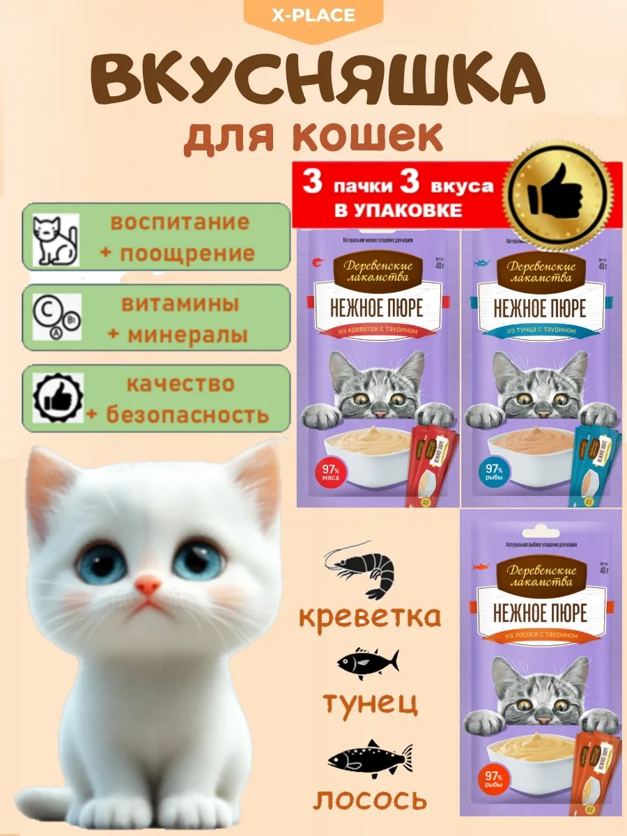 Нежное пюре для милых созданий Деревенские лакомства – идеальное дополнение кошачьего рациона. Оно создано по уникальной формуле с использованием исключительно натуральных компонентов, обладает непревзойденным ароматом, который непременно оценит каждый маленький котенок и привередливая взрослая кошечка. В ассортименте представлен набор из 3 вкусов: креветка, лосось и тунец, . Все составы обогащены таурином и минералами. В коллекции есть также наборы по 4, 6 и 10 штук. Вкусняшки на основе морепродуктов и рыбного бульона с растительным маслом и добавлением соли содержат комплекс витаминов, необходимых для полноценного роста и поддержания здоровья животных. Ваш домашний питомец непременно полюбит такую вкусность. Он соответствует нормам ветеринарии и принципам здорового питания. Съедобный деликатес богат протеином и позволит легко приучить котика к полезной еде. Это настоящее угощение для всех кошечек. Влажное угощение может использоваться в качестве средства для дрессировки и приучения питомца, положительно влияет на желудок и иммунную систему. Зоотовары выпускаются в мягкой упаковке удобного размера. Одной пачки хватит на большую миску. Такие полезные штучки станут идеальным выбором для кормления котов и кошек и взрослых животных. Благодаря тщательно подобранному составу, продукция обеспечивает полноценное питание, насыщает всеми необходимыми полезными веществами и витаминами. Ее с удовольствием будут есть все, даже самые требовательные коты. При этом хозяину не придется переживать по поводу выбора меню для домашнего любимца. Все необходимые питательные вещества находятся в одной упаковке!