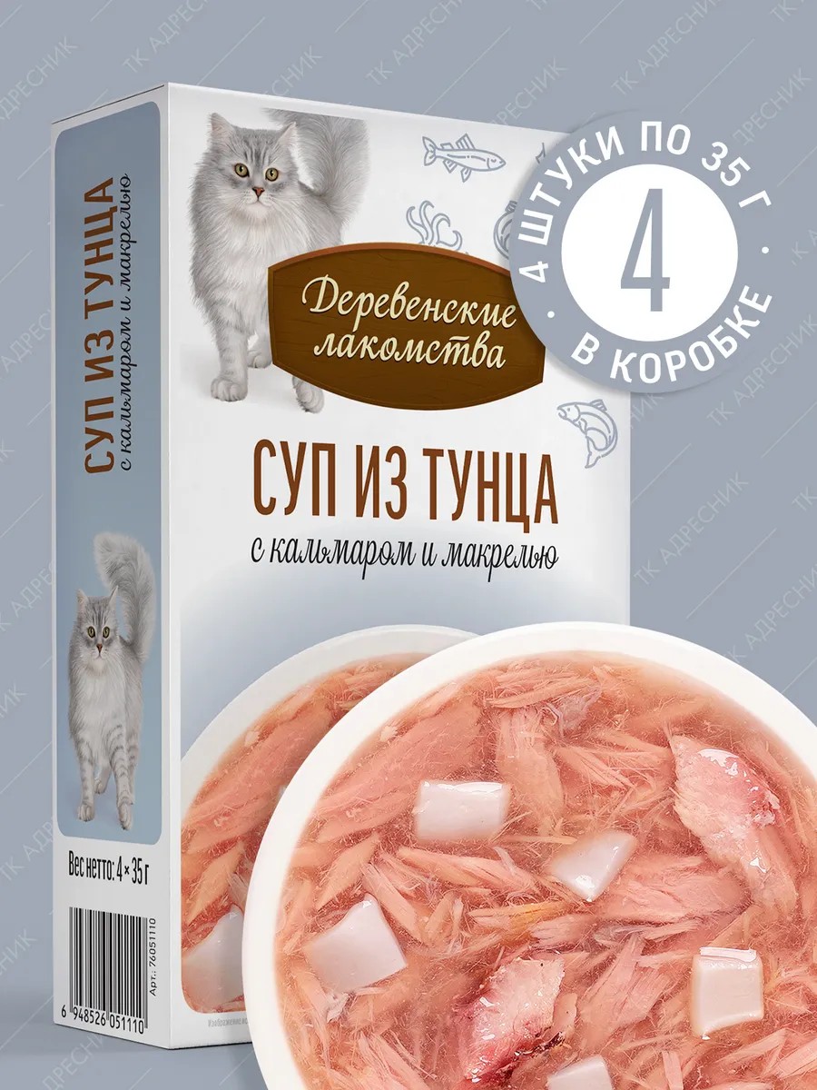 Деревенские лакомства Лакомство для кошек Суп с кальмаром и макрелью, 4х35гр