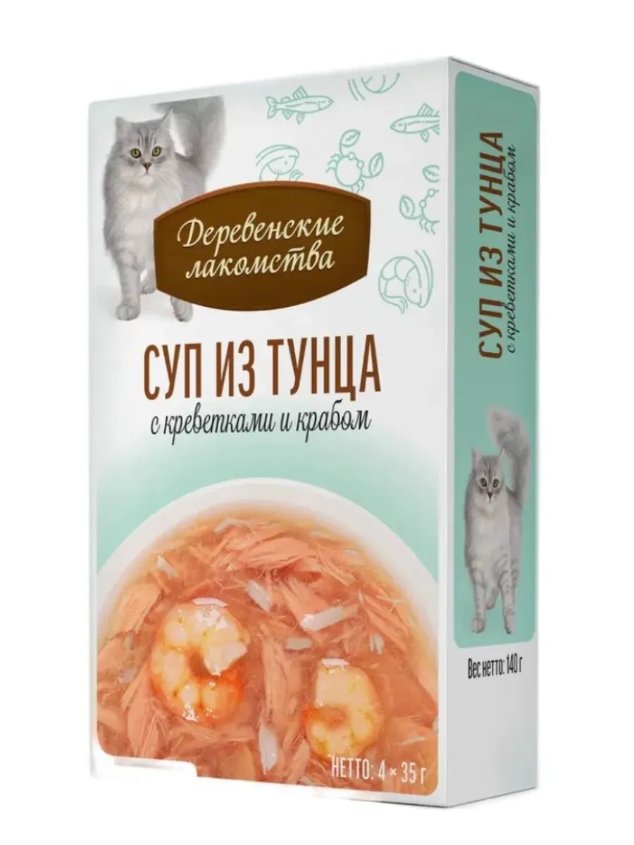 Деревенские лакомства Паучи для кошек Суп из тунца с креветками и крабом 35 гр 4 шт