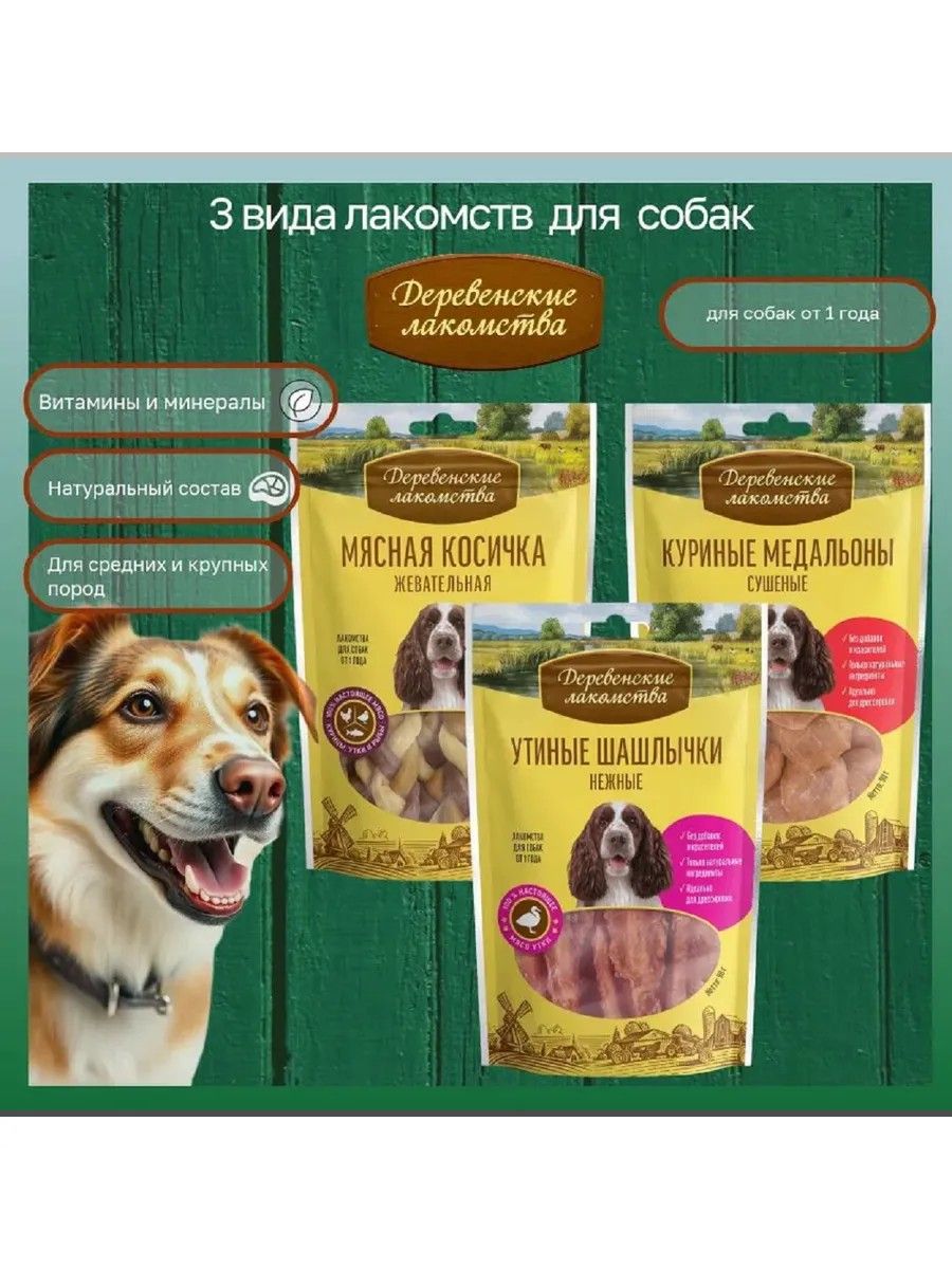 Деревенские лакомства Куриные медальоны+утиные шашлычки+косичка жевательная мясная