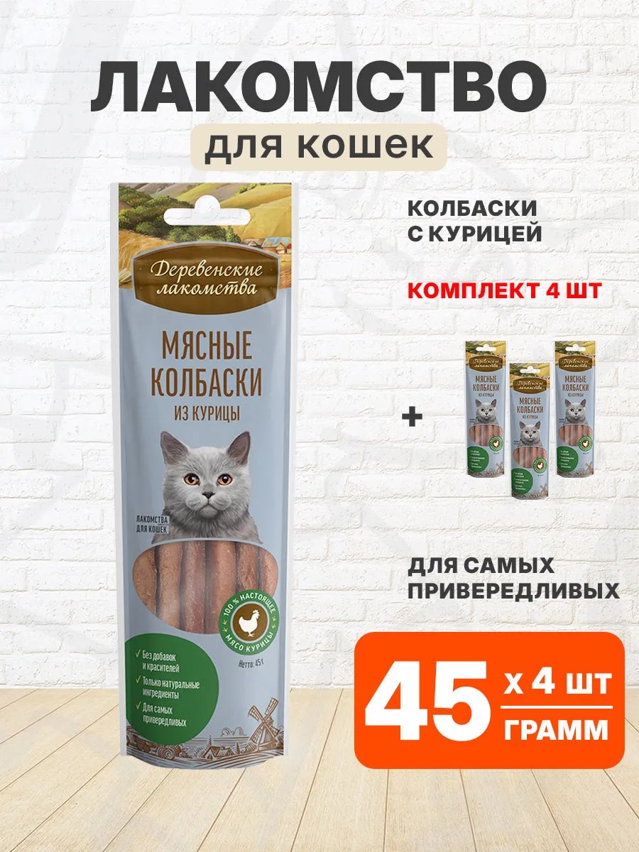| Комплектация | Лакомства деревенские колбаски из курицы для поощрения кошек 45 гр - 4 шт |