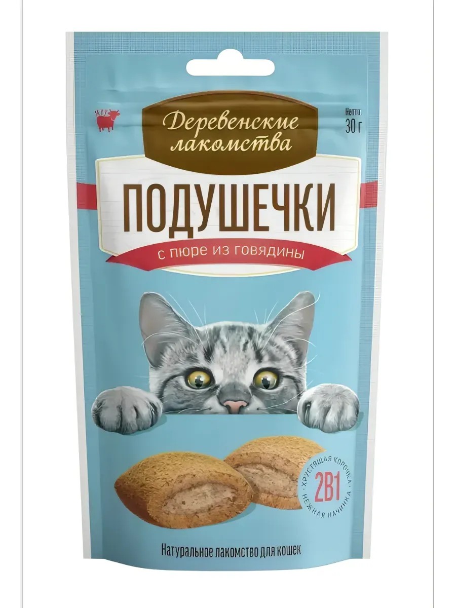 Деревенские лакомства, Лакомство для кошек Подушечки с пюре из говядины, 30 г. В основе "Деревенских лакомств" лежат традиции поощрения домашних питомцев, совмещенные с современными знаниями в области ветеринарии и здорового питания животных. Натуральные лакомства для кошек изготовлены с учетом сбалансированного питания из качественных, безопасных и тщательно подобранных ингредиентов, обогащены витаминами и минералами.