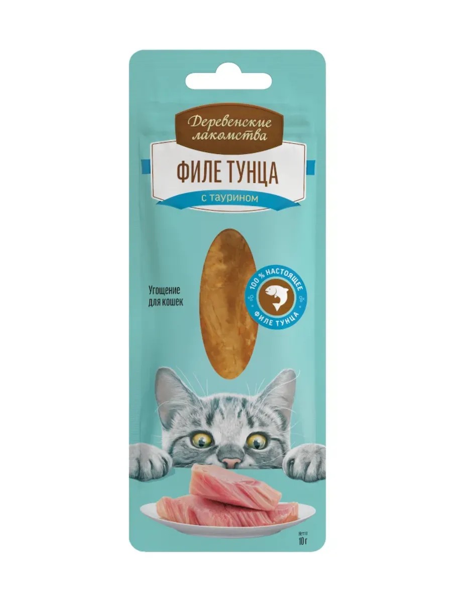 Лакомство для кошек Деревенские лакомства Филе тунца нежное с таурином, кусочки рыбы, 10г / влажный корм. Цена за 1 шт. Лакомство для кошек Деревенские лакомства Филе тунца нежное с таурином - вкусный и полезный продукт для четвероногих членов семьи. Кошки с удовольствием поглощают его и готовы ради него обучиться сложным командам и стать самым послушным питомцем для своего хозяина. Оно приведет в восторг даже самого привередливого питомца. Продукт отвечает всем требованиям безопасности для здоровья животных и содержит только разрешенные контролем качества ингредиенты: филе тунца. Нежнейшее филе тунца в собственном соку - изысканное угощение для самых любимых. Лакомство обогащено таурином, который не только усиливает природный вкус, но и способствует поддержанию здоровья сердца и иммунной системы. Влажное лакомство не приведет к избыточному весу, нормализует пищеварение, улучшит состояние шерсти, зубов, костей. Нежное филе для кошек одинаково подходит для активных и для выздоравливающих после болезни питомцев. Хотите, чтобы ваш пушистый друг питался только вкусной пищей и получал от этого настоящее удовольствие? Купите сытное, полезное лакомство Деревенские лакомства Филе тунца нежное с таурином! Деревенские лакомства для кошек / еда для кошек / влажный корм.