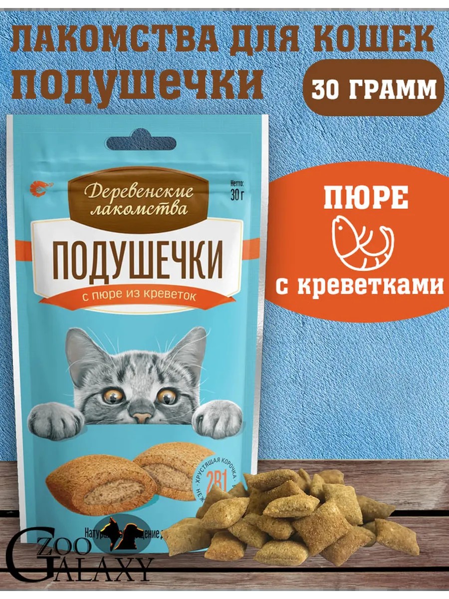 Деревенские лакомства Лакомство для кошек подушечки с пюре из креветок 30г