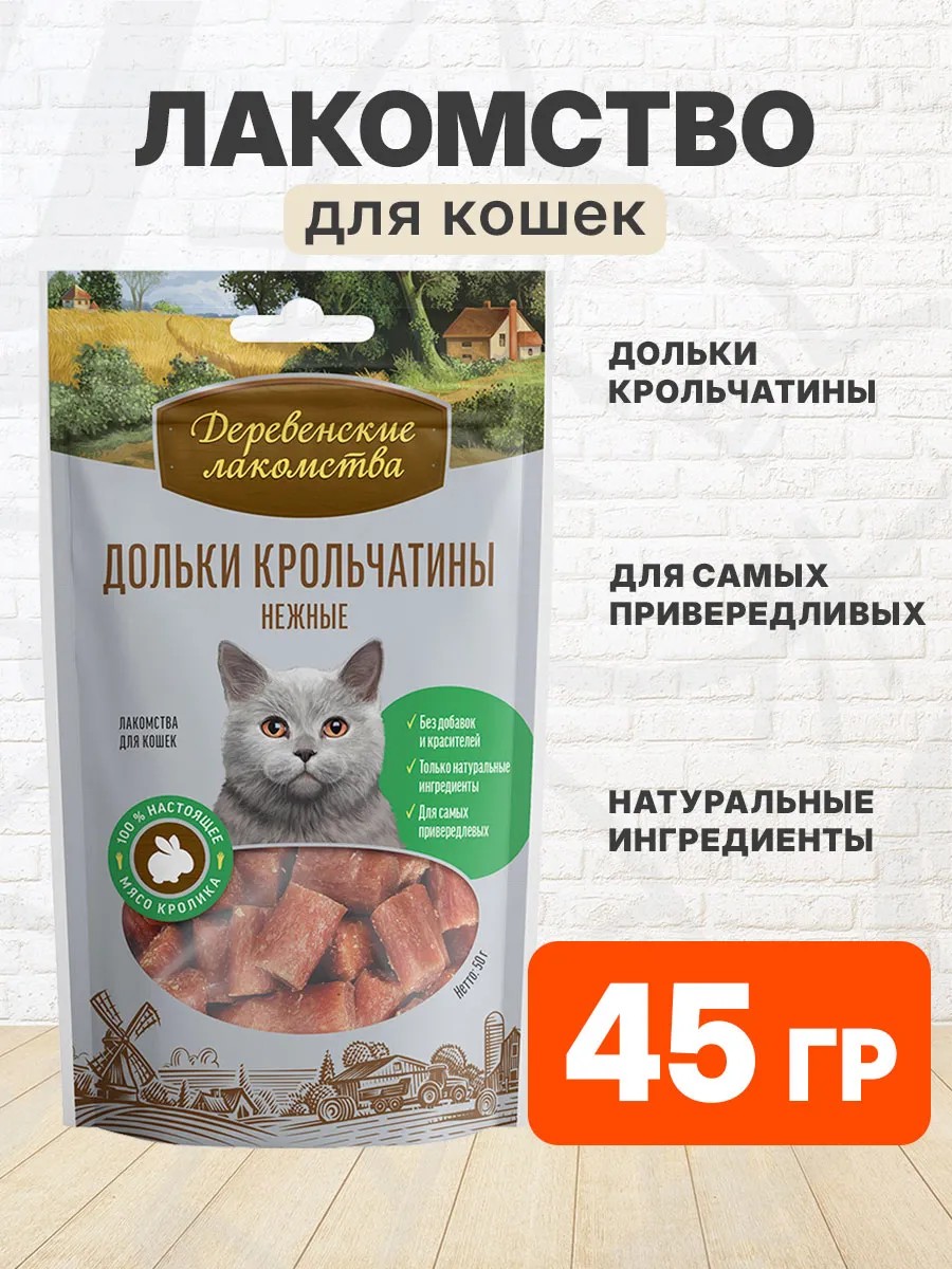 | Комплектация | Лакомства деревенские для кошек и котят дольки из мяса кролика 45 гр - 1 шт |