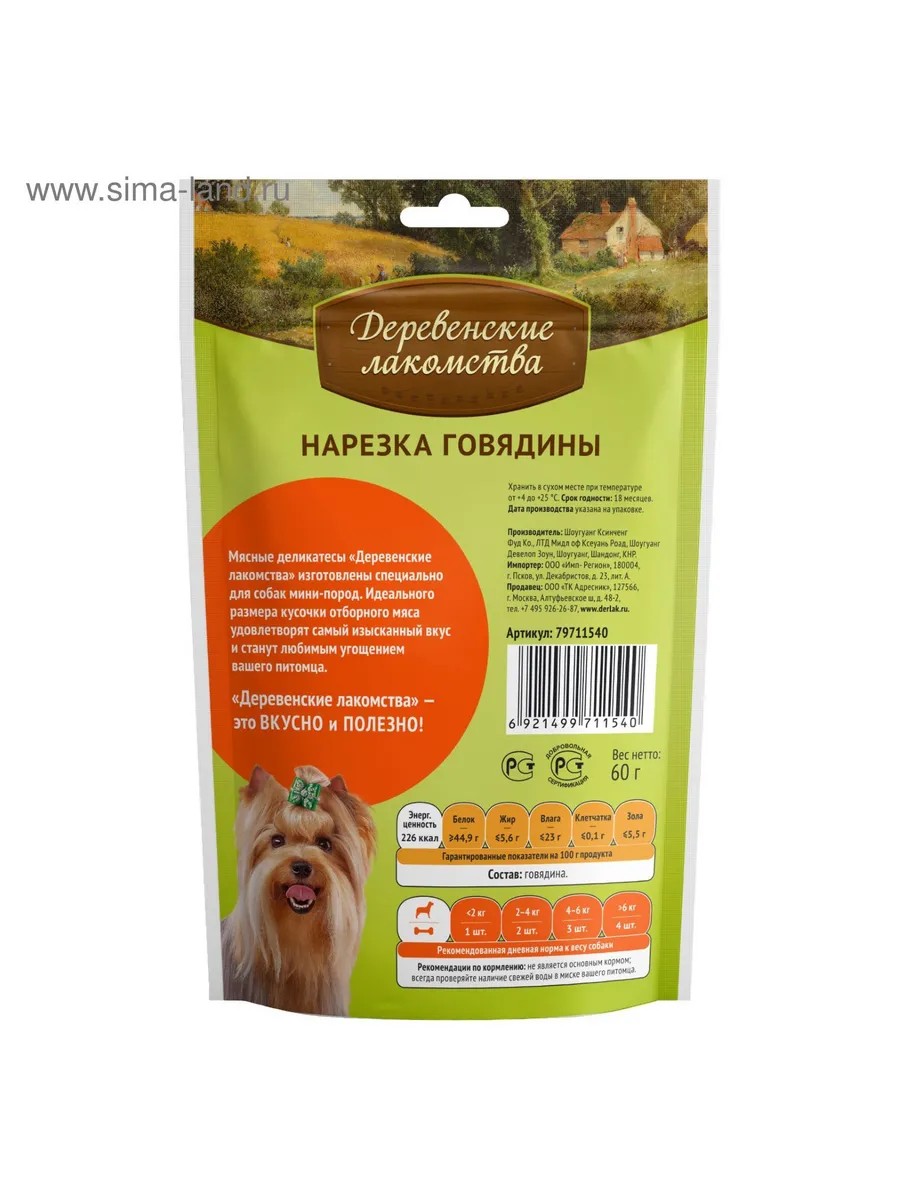 Нарезка из говядины "Деревенские лакомства" для собак мини-пород, 55 г. Нарезка из нежнейшей говядины - традиционное лакомство с отличным вкусом! Что может быть лучше для поощрения и дрессировки?Состав: говядина.Гарантированные показатели на 100 г продукта:Белок 44,00 гЖир 5,60 гВлага 23,00 гКлетчатка 0,10 г