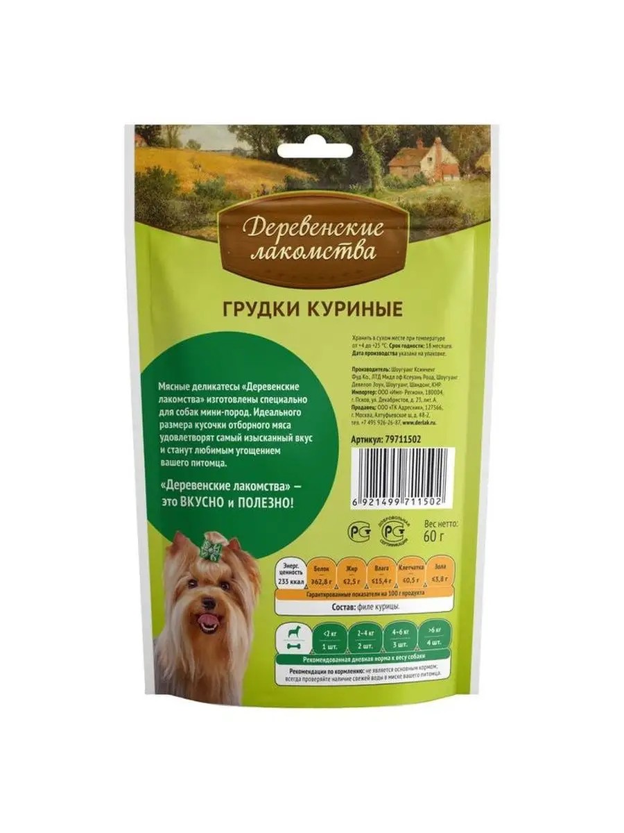 Derevenskie Treats Chicken Breasts for Small Dogs, 55g. Baked chicken breast fillet is a great way to keep your little one occupied and distracted from your things while you're away. Dog treats from the Derevenskie Treats brand are based on the traditions of rewarding pets, combined with modern knowledge in veterinary medicine and healthy animal nutrition. Natural meat treats for dogs are enriched with vitamins and minerals, made with balanced nutrition in mind from high-quality, safe, and carefully selected ingredients. Baked chicken breast fillet is a great way to keep your little one occupied and distracted from your things while you're away. This treat is specially designed for small breed dogs. Ingredients: chicken fillet.