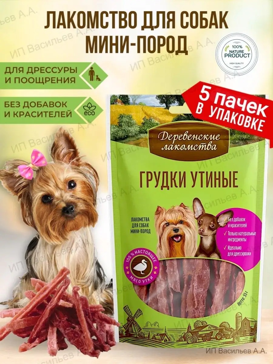 Порадуйте своего питомца вкусняшками Деревенские лакомства Грудки утиные. Это полезные лакомства для собак мелких и средних пород, которые обеспечат вашего любимца витаминами и минералами. Вкусняшки подходят для разных целей: дрессировки, чистки зубов или как просто угощение для вашего питомца. Они имеют небольшой размер, что делает их идеальными для маленьких собачек. Получайте удовольствие от покупки зоотоваров для вашего самого любимого зверька, ведь при выведении их состава мы руководствовались последними исследованиями в ветеринарии. Наш продукт натурального происхождения содержит настоящее мясо утки с субпродуктами растительного происхождения. Это полезная и вкусная добавка к основному комплексному питанию вашего любимца, позволяющая разнообразить сбалансированный рацион. Наши полезные палочки из сушеного и вяленого мяса способствуют правильному росту и развитию домашних животных. Это долгоиграющие жевательные продукты в виде хрустиков, способствующие очищению от зубного налета. Используйте эти пищевые деликатесы для системы ухода за деснами, во время дрессировки или приучения в качестве поощрения. Подарите вашему любимцу восторг и позаботьтесь о его здоровье! Они подходят для всех возрастов животных, в том числе для пожилых питомцев. Эти сухие, но мягкие съедобные хрустики, содержащие мясо утки с кальцием. Это отличное средство для нежной очистки зубов и обогащения организма питомца минералами и витаминами. Вы можете приобрести один пакетик или подарочный набор, состоящий из 3, 4, 5 или 10 пачек. Срок хранения этих продуктов составляет 18 месяцев с даты, указанной на упаковке. У нас есть акции и распродажи, вы можете купить наши товары в подарок или со скидкой!