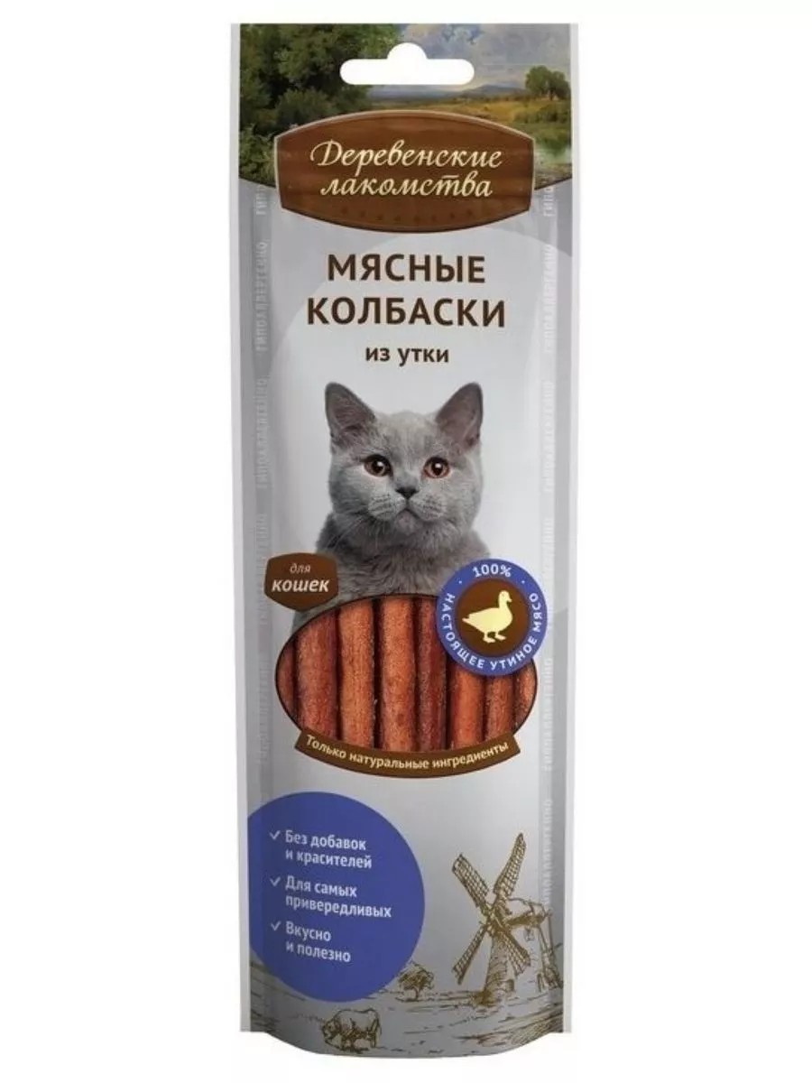 Деревенские лакомства, лакомство для кошек, мясные колбаски из утки, 45 г., 1 уп.В основе «Деревенских лакомств» лежат традиции поощрения домашних питомцев, совмещенные с современными знаниями в области ветеринарии и здорового питания животных. Натуральные лакомства для кошек изготовлены с учетом сбалансированного питания из качественных, безопасных и тщательно подобранных ингредиентов, обогащены витаминами и минералами. Лучшие мясные и рыбные продукты в идеальном сочетании с полезными пищевыми добавками: витамином Е, таурином и рыбьим жиром – главный принцип, которому мы следуем в рецептах кормов и лакомств для кошек. Наши колбаски из мяса утки пользуются большой любовью у всех кошек. Побалуйте и вы свою.