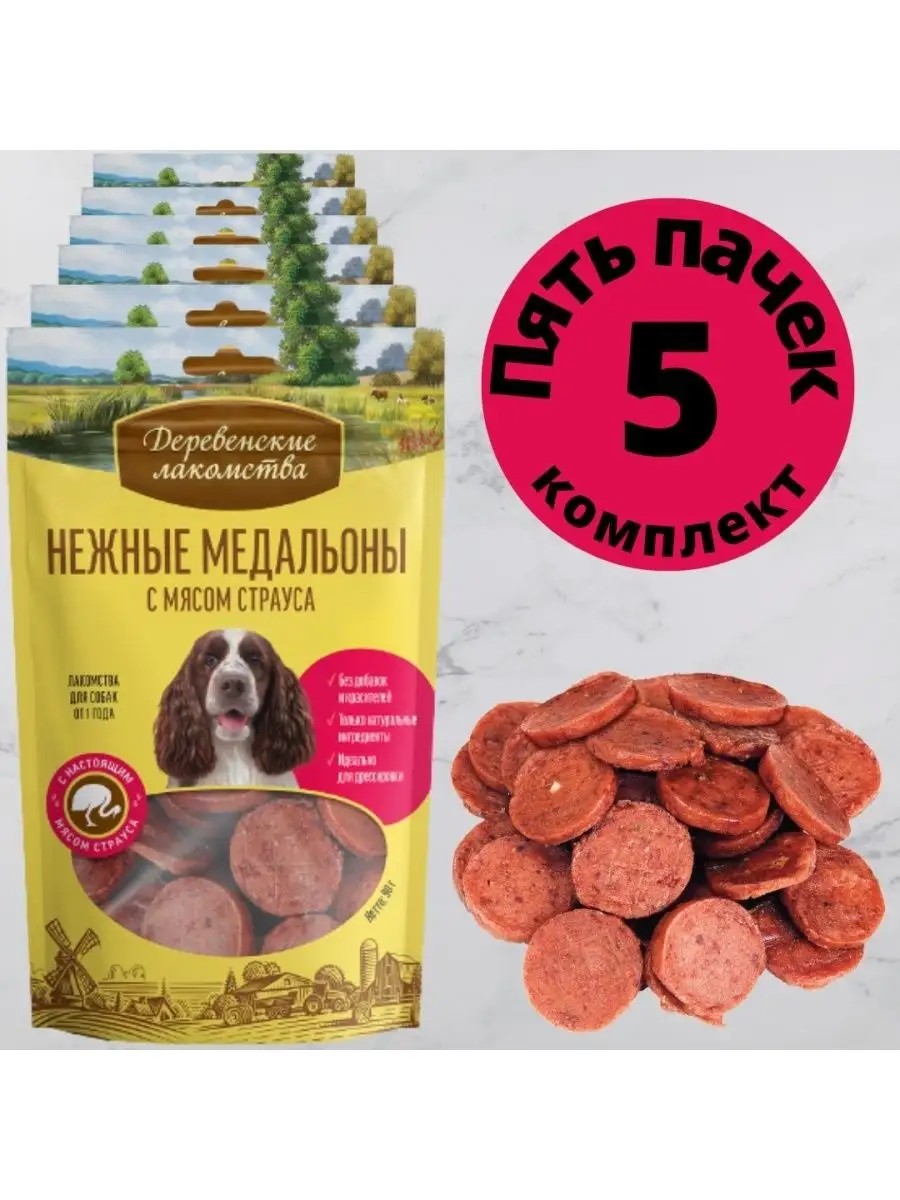 Деревенские лакомства Нежные медальоны с мясом страуса для собак, 5 шт по 90г
