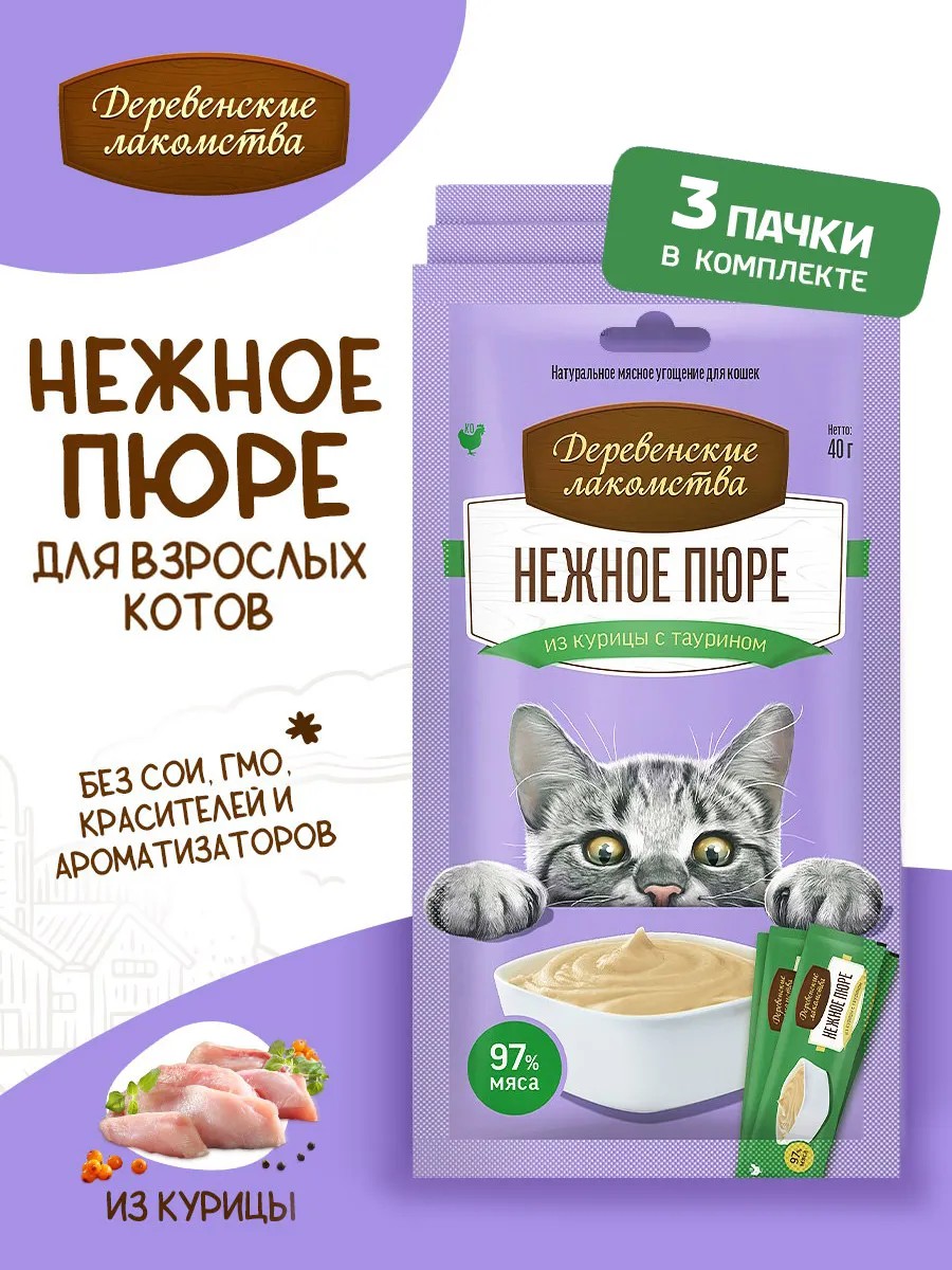 КомплектацияДеревенские лакомства для кошек Нежное пюре из курицы; Деревенские лакомства для кошек