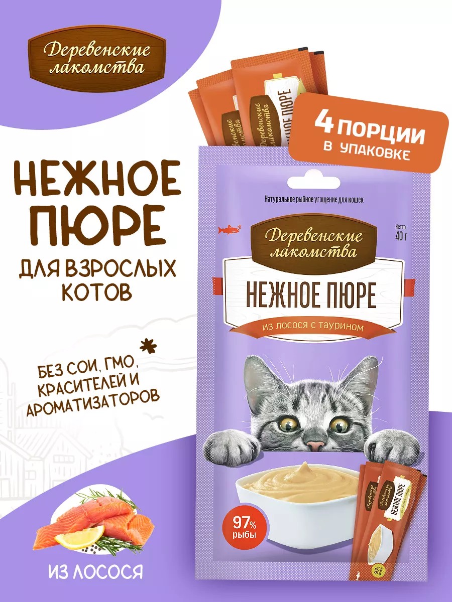 КомплектацияДеревенские лакомства для кошек Нежное пюре из лосося
