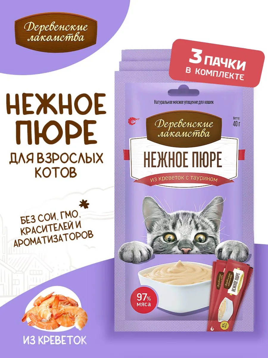 | Комплектация | Деревенские лакомства для кошек Нежное пюре креветки |