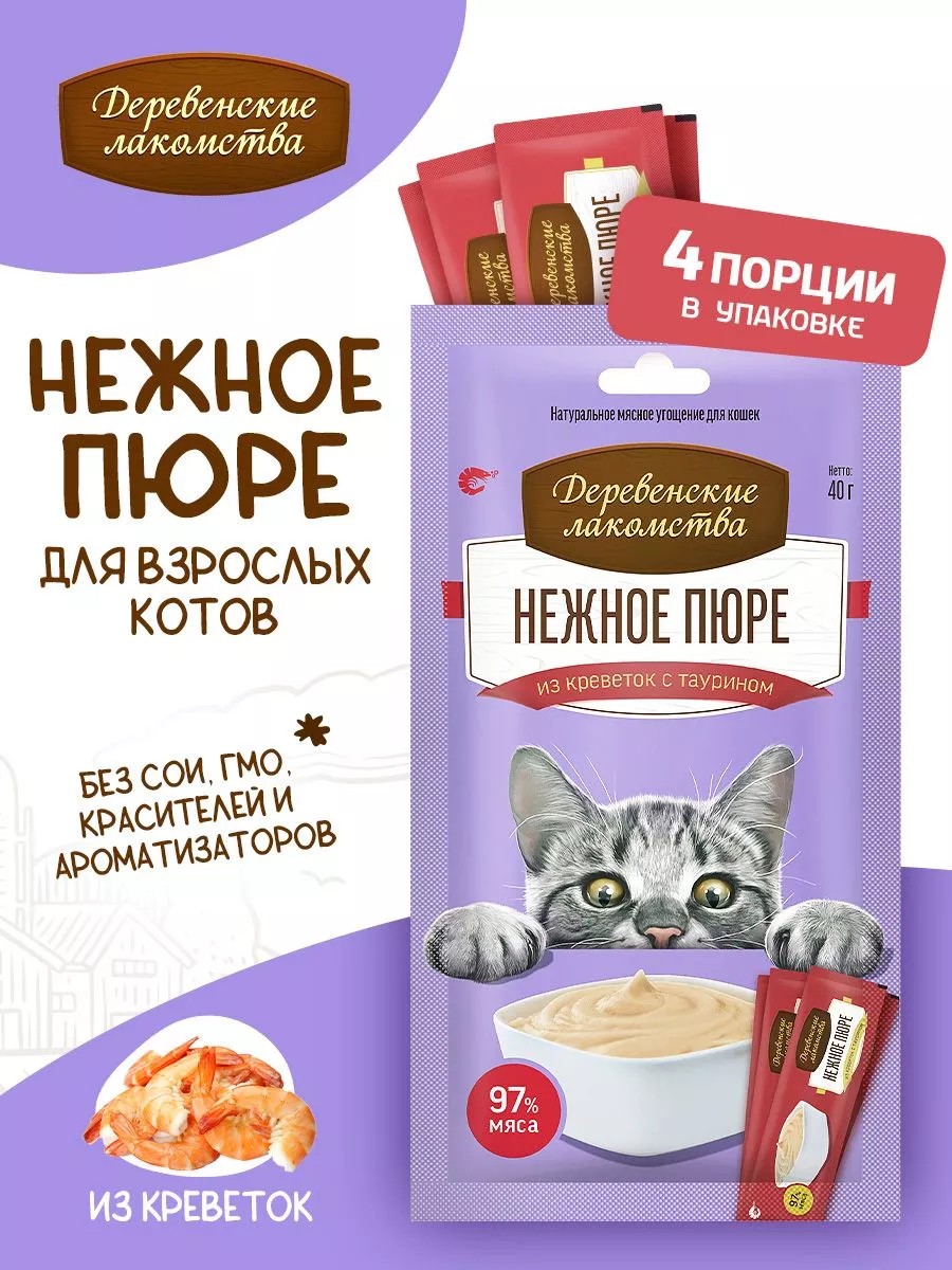 | Комплектация | Деревенские лакомства для кошек Нежное пюре креветки |