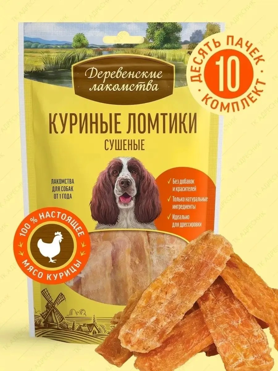 | Комплектация | Лакомство для собак "Деревенские лакомства" куриные ломтики сушеные (10шт х 90гр) |