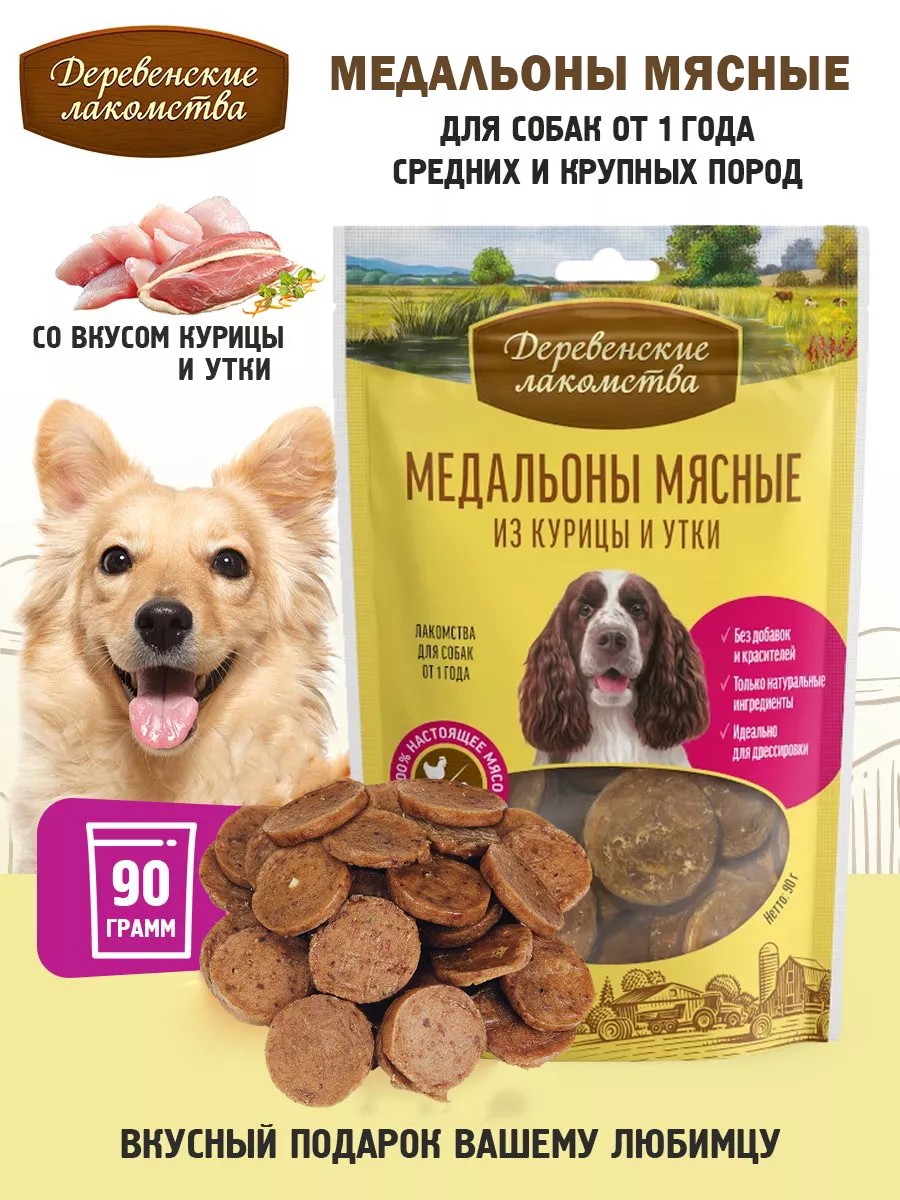 Деревенские лакомства Лакомства для собак Медальоны мясные из курицы и утки 90 гр