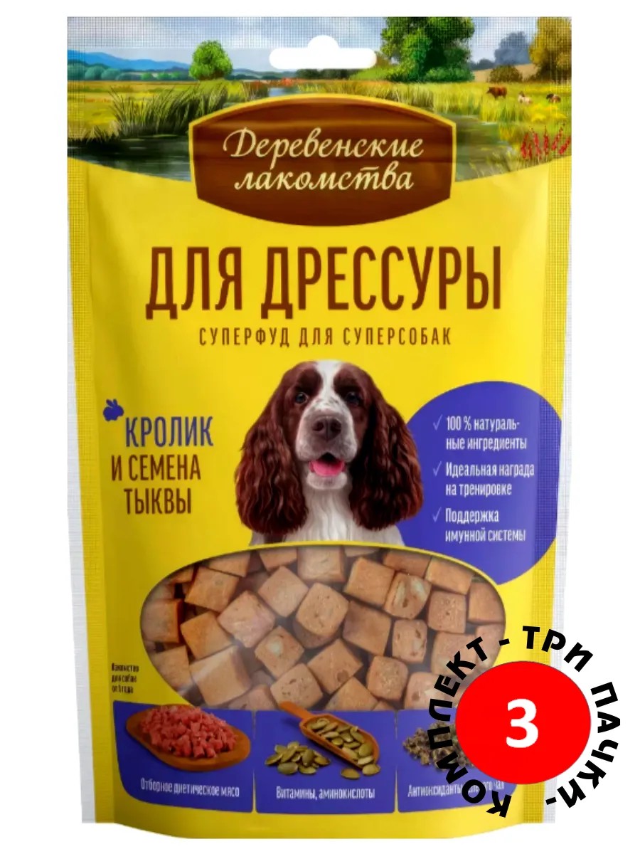В основе «Деревенских лакомств» лежат традиции поощрения домашних питомцев, совмещенные с современными знаниями в области ветеринарии и здорового питания животных. Натуральные лакомства для взрослых собак всех пород изготовлены с учетом сбалансированного питания из качественных, безопасных и тщательно подобранных ингредиентов. "Деревенские лакомства" отбираются и обрабатываются вручную и могут служить эталоном лакомств для домашних животных. Новое лакомство создано специально для дрессуры собак. Семена тыквы славятся высоким содержанием витаминов, аминокислот и минералов. В сочетании с диетическим мясом кролика это лакомство становится полезным и необычайно вкусным. Кусочки имеют универсальный размер, что делает их идеальными для разного размера питомцев. Это полезная и вкусная добавка к основному комплексному питанию вашего любимца, позволяющая разнообразить сбалансированный рацион.
