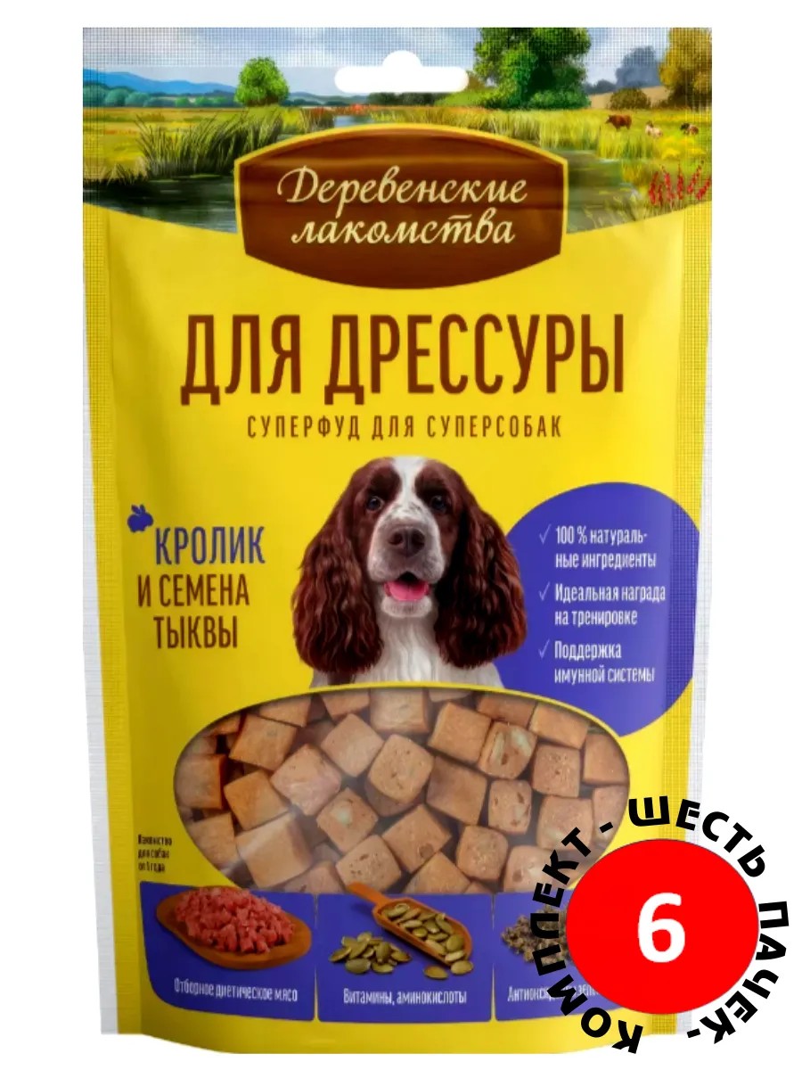 В основе «Деревенских лакомств» лежат традиции поощрения домашних питомцев, совмещенные с современными знаниями в области ветеринарии и здорового питания животных. Натуральные лакомства для взрослых собак всех пород изготовлены с учетом сбалансированного питания из качественных, безопасных и тщательно подобранных ингредиентов. "Деревенские лакомства" отбираются и обрабатываются вручную и могут служить эталоном лакомств для домашних животных. Новое лакомство создано специально для дрессуры собак. Семена тыквы славятся высоким содержанием витаминов, аминокислот и минералов. В сочетании с диетическим мясом кролика это лакомство становится полезным и необычайно вкусным. Кусочки имеют универсальный размер, что делает их идеальными для разного размера питомцев. Это полезная и вкусная добавка к основному комплексному питанию вашего любимца, позволяющая разнообразить сбалансированный рацион.