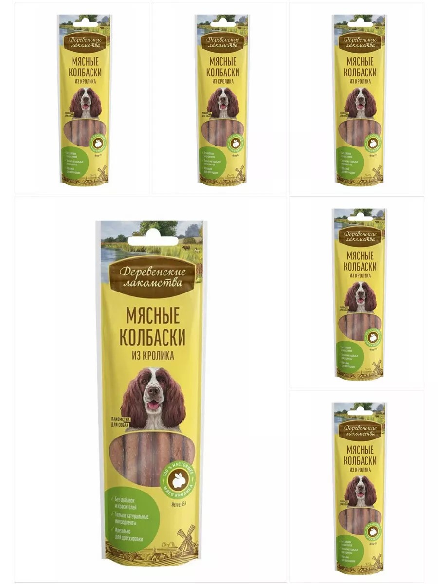 Village Treats Dog Treats Rabbit Sausages. 45 g, 6 pcs. The dog treats and food from the "Village Treats" brand are based on the traditions of rewarding pets, combined with modern knowledge in veterinary medicine and healthy animal nutrition. Natural meat treats for dogs are enriched with vitamins and minerals, made with a balanced diet from high-quality, safe, and carefully selected ingredients. These dog sausages made from the freshest rabbit meat break easily into small pieces and are suitable for training or treats. Your dog will be happy! Intended for dogs of all breeds. Ingredients: rabbit meat, vegetable by-products, minerals. Nutritional value, %: - proteins - 27 - fats - 8 - fiber - 0.1 - ash - 5.5 - moisture - 25 - Energy value: 180 kcal/100 g. The product is certified.