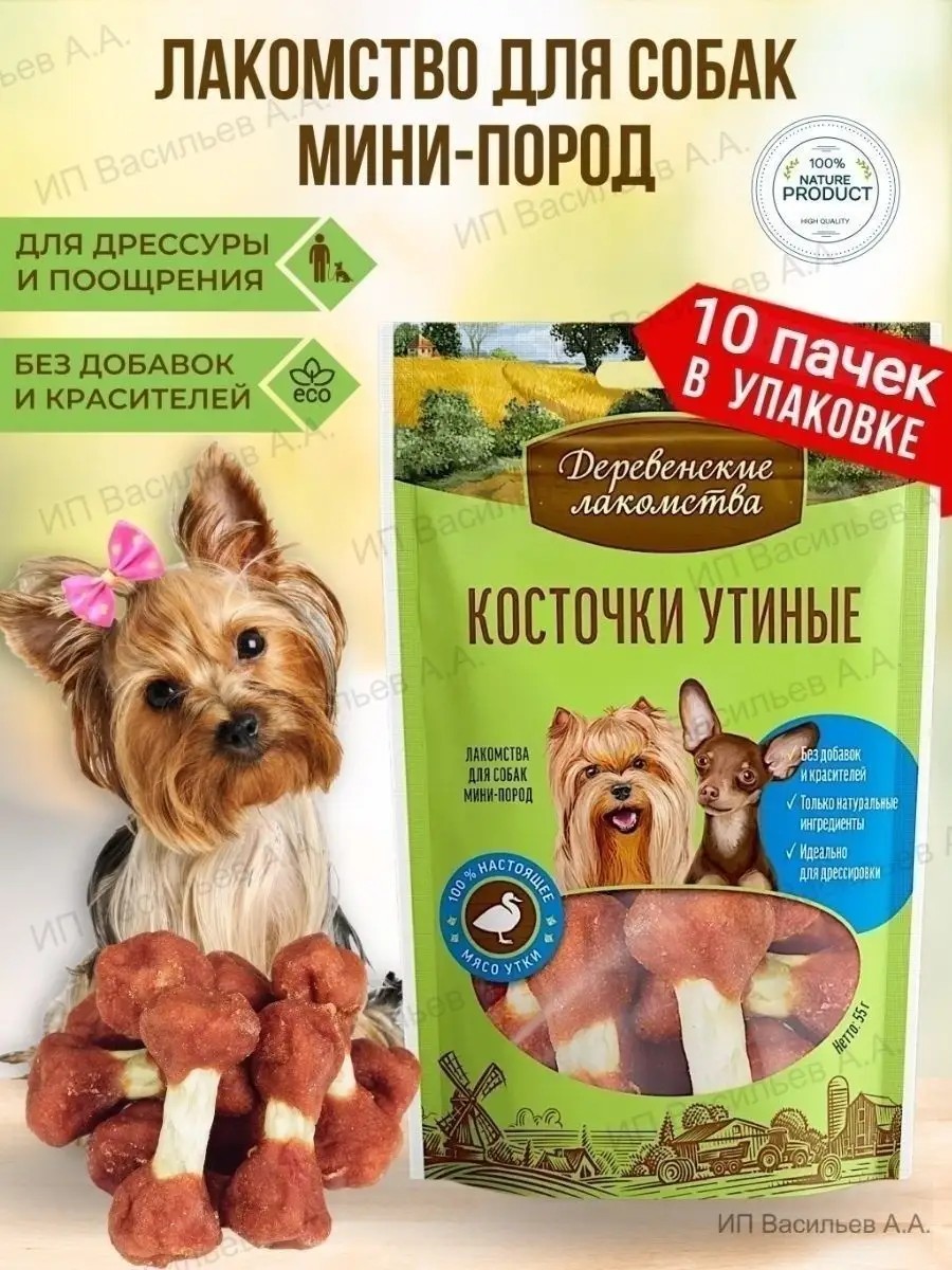 Косточки утиные бренда Деревенские лакомства лучшее угощение для собак. Они созданы на основе натуральных, тщательно отобранных компонентов, богаты витаминами и минералами, необходимыми для поддержания здоровья и активного роста домашних животных. В набор входят маленькие утиные косточки. Можно приобрести как 1 пачку, так и упаковки из 3, 4, 5 и 10 пакетиков. При их изготовлении использовалось свежее утиное филе. Кроме того, в составе есть сыромятная говяжья кожа и субпродукты растительного происхождения. Эти съедобные вкусности в виде сушеных долгоиграющих косточек можно использовать в качестве самостоятельного угощения между привычным приемом пищи. Эти вещи способны выступить отличным средством для ухода за пастью и очистки от зубного налета. В них содержатся белки, жиры и углеводы в оптимальных долях, обогащенные кальцием, который крайне важен для формирования скелета и нормального функционирования опорно-двигательного аппарата. Тщательно подобранная формула разработана с учетом норм ветеринарии. Продукция не вызывает аллергии, обеспечивает эффективную профилактику кариеса и воспаления десен. Эти зоотовары настоящий деликатес, содержащий комплекс полезных веществ для собачьего здоровья. Сушеный десерт положительно отражается на состоянии кожи, способствует выведению токсинов и удовлетворению жевательных инстинктов. Пищевой продукт подходит для кормления любой собачки малых и средних, больших размеров. Это идеальное дополнение рациона питания. Его можно использовать для воспитания и дрессировки. С такими лакомствами приучить питомца выполнять команды будет намного проще. Они не вызывают сложностей в хранении и могут выступить отличной подарочной идеей. У нас есть акции и распродажи, вы можете купить наши товары в подарок со скидкой!