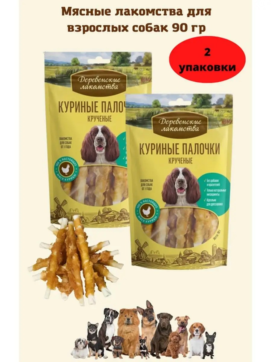 | Комплектация | Деревенские лакомства 0,09кг куриные палочки крученые для собак; комплект из 2-х упаковок |