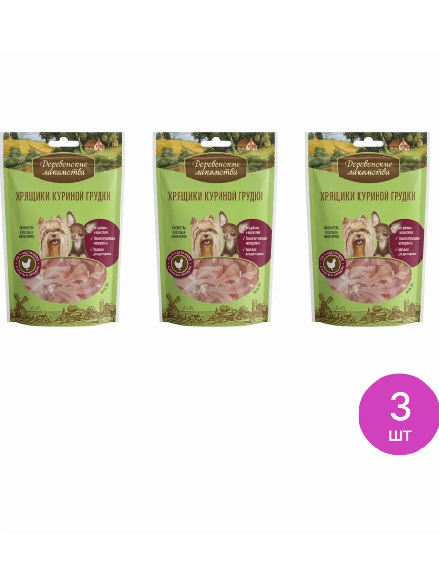 Деревенские лакомства Лакомство для собак Хрящики куриной грудки/ сухой корм, 3 шт