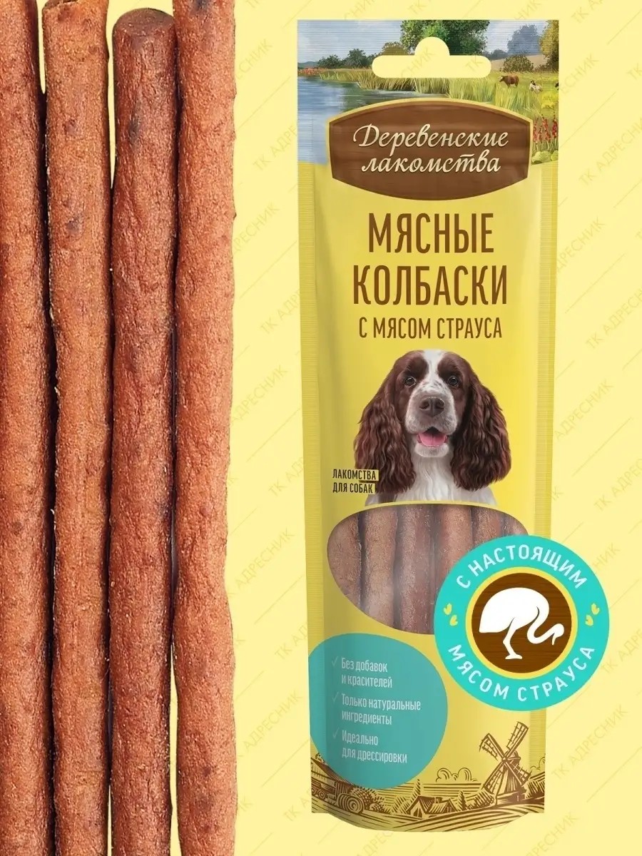 Идеальные для дрессуры и поощрения "Деревенские лакомства" отбираются и обрабатываются вручную и могут служить эталоном лакомств для домашних животных. Мясные колбаски с мясом страуса - 100% натуральное диетическое лакомство, идеальное для контроля веса. Подходит для собак с чувствительным пищеварением. Экзотический вкус мяса страуса не оставит равнодушными даже самых привередливых собак.