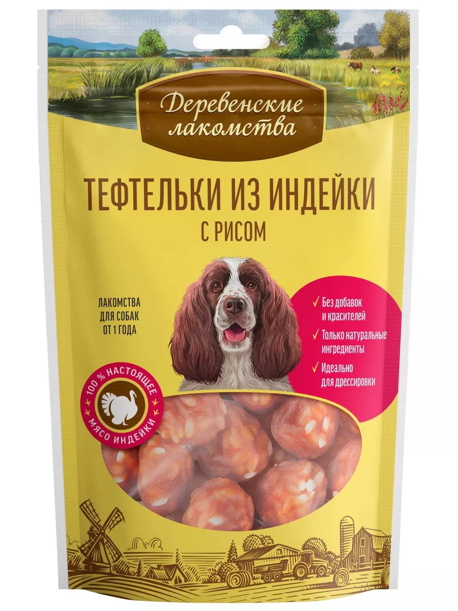 Лакомство Деревенские лакомства для собак, тефтельки из индейки с рисом, 85 г. Тефтельки из индейки с рисом.
