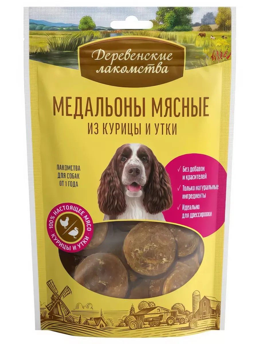 Деревенские лакомства Лакомство для собак, медальоны мясные из курицы и утки, 90 г