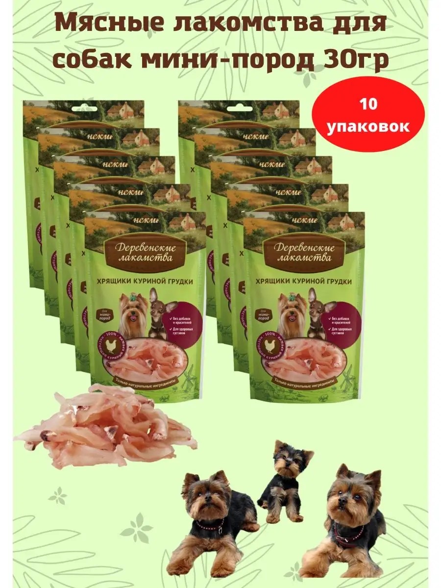 | Комплектация | Деревенские лакомства 0,03кг хрящики куриной грудки для собак мини-пород; Комплект из 10-и упаковок |