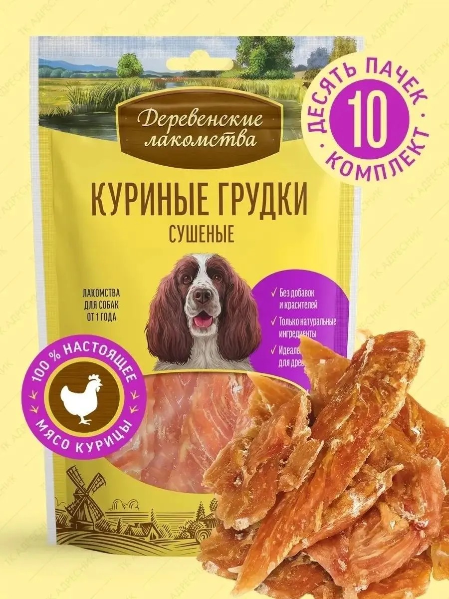 | Комплектация | Лакомство для собак "Деревенские лакомства" куриные грудки сушеные (10шт х 90гр) |