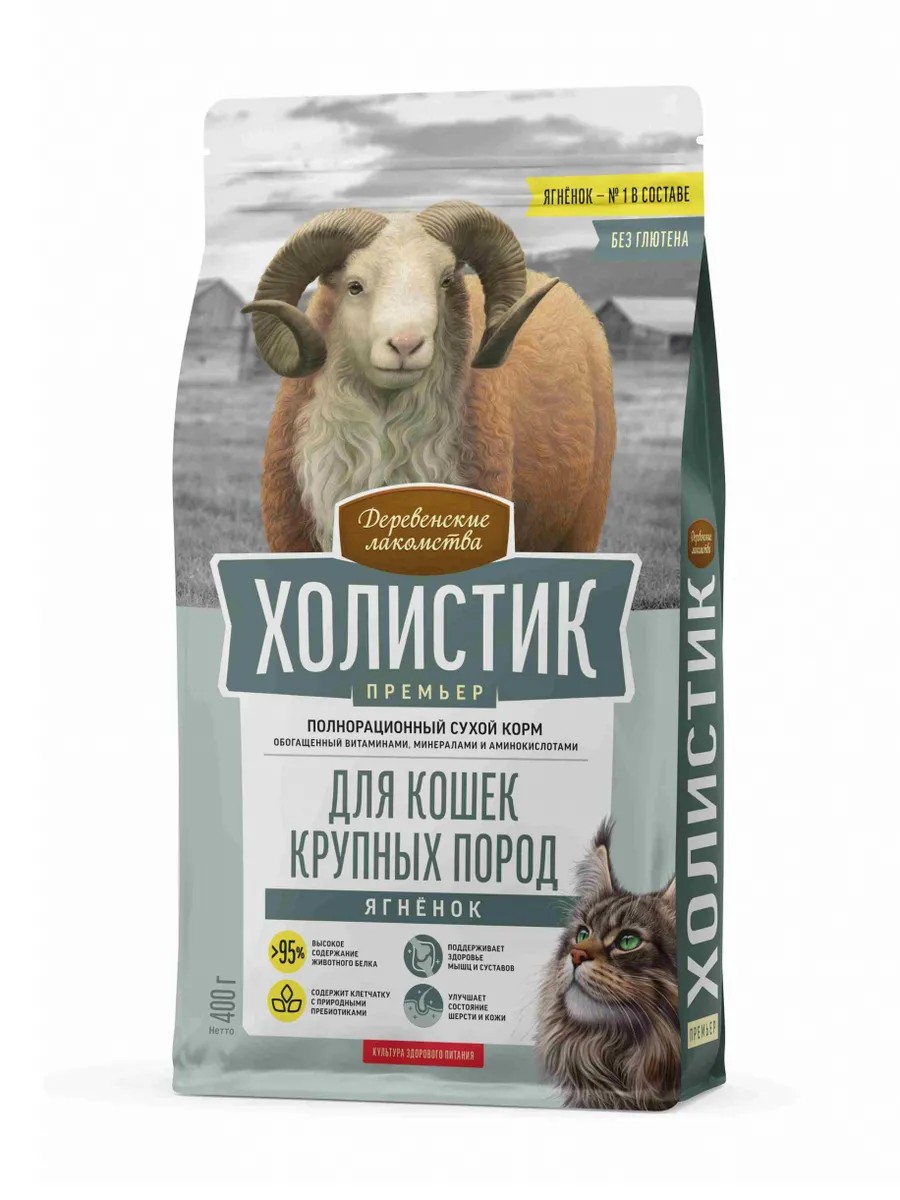 Деревенские лакомства, Сухой корм для кошек крупных пород, ягненок, 400 г. Полнорационный корм для кошек крупных пород Холистик Премьер — это сбалансированное питание, созданное с учетом физиологических особенностей и потребностей крупных кошек. В составе корма используются высококачественные белки, витамины, минералы и жирные кислоты, которые способствуют поддержанию отличной физической формы, здоровья суставов и костей, блестящей шерсти и нормальной работы сердца вашего питомца. Рекомендации по кормлению: корм предназначен для взрослых кошек от 1 года. Суточную норму рекомендуется делить на несколько приемов пищи. Потребности кошки могут отличаться в зависимости от возраста и уровня активности. Котятам, беременным и кормящим кошкам требуется специальная диета. Используйте рекомендации как основу и корректируйте рацион в зависимости от индивидуальных особенностей питомца. Всегда обеспечивайте кошке доступ к свежей питьевой воде.