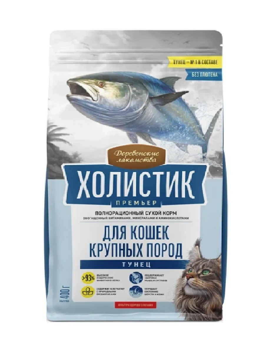 Деревенские лакомства, Сухой корм для кошек крупных пород, тунец, 400 г. Полнорационный корм для кошек крупных пород Холистик Премьер — это сбалансированное питание, созданное с учетом физиологических особенностей и потребностей крупных кошек. В составе корма используются высококачественные белки, витамины, минералы и жирные кислоты, которые способствуют поддержанию отличной физической формы, здоровья суставов и костей, блестящей шерсти и нормальной работы сердца вашего питомца. Рекомендации по кормлению: корм предназначен для взрослых кошек от 1 года. Суточную норму рекомендуется делить на несколько приемов пищи. Потребности кошки могут отличаться в зависимости от возраста и уровня активности. Котятам, беременным и кормящим кошкам требуется специальная диета. Используйте рекомендации как основу и корректируйте рацион в зависимости от индивидуальных особенностей питомца. Всегда обеспечивайте кошке доступ к свежей питьевой воде.