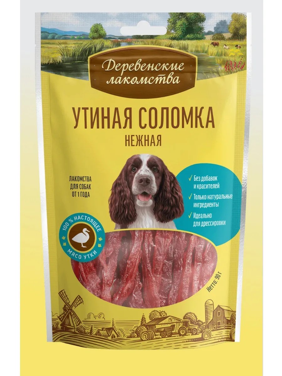 В основе «Деревенских лакомств» лежат традиции поощрения домашних питомцев, совмещенные с современными знаниями в области ветеринарии и здорового питания животных. Натуральные лакомства для собак изготовлены с учетом сбалансированного питания из качественных, безопасных и тщательно подобранных ингредиентов. Идеальные для дрессуры и поощрения "Деревенские лакомства" отбираются и обрабатываются вручную и могут служить эталоном лакомств для домашних животных. Нежная тонкая соломка из утиного мяса раздразнит любого привереду. Будьте готовы к тому, что вас будут просить ещё и ещё. Состав: филе утки.